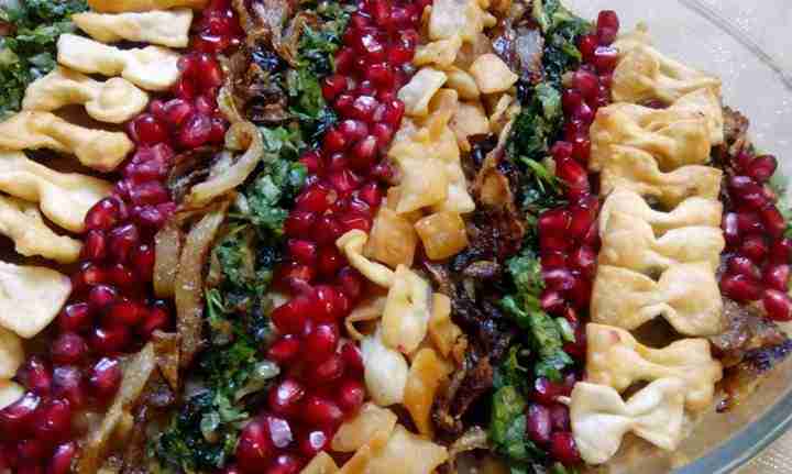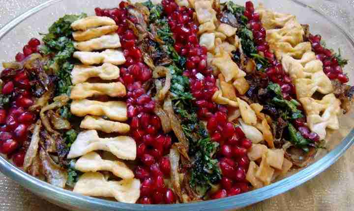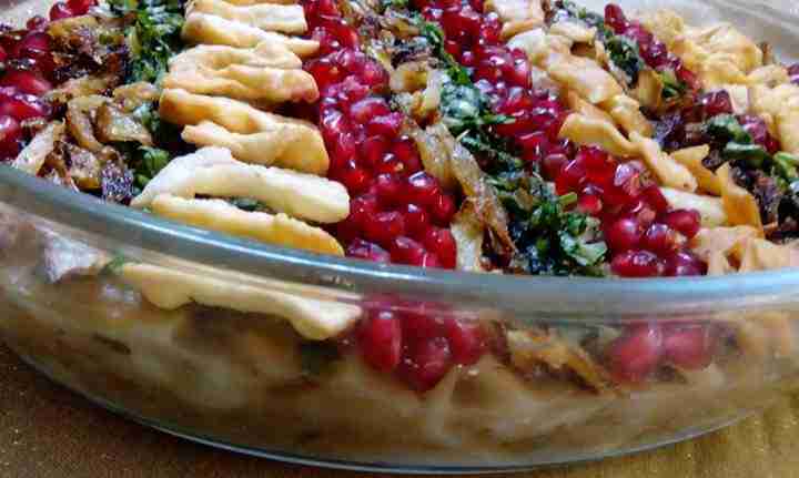 يصب في طبق التقديم ويزين بالعجين المقلي او الخبز المقلي والبصل المقلي والتومة والكزبرة وممكن رشة من السماق و دبس الرمان و الرمان الحب