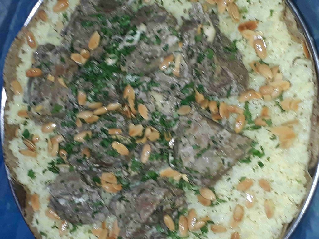 بعد هيك بنحط رغيف خبز شراك بالسدر وبنشربو شوي من شراب المنسف وبنحط الرز فوقها وبندهن وجه الرز بالسمنة البلدي وبنحد اللحمة وبنزينو بالبقدونس واللوز وصحتين وعافية