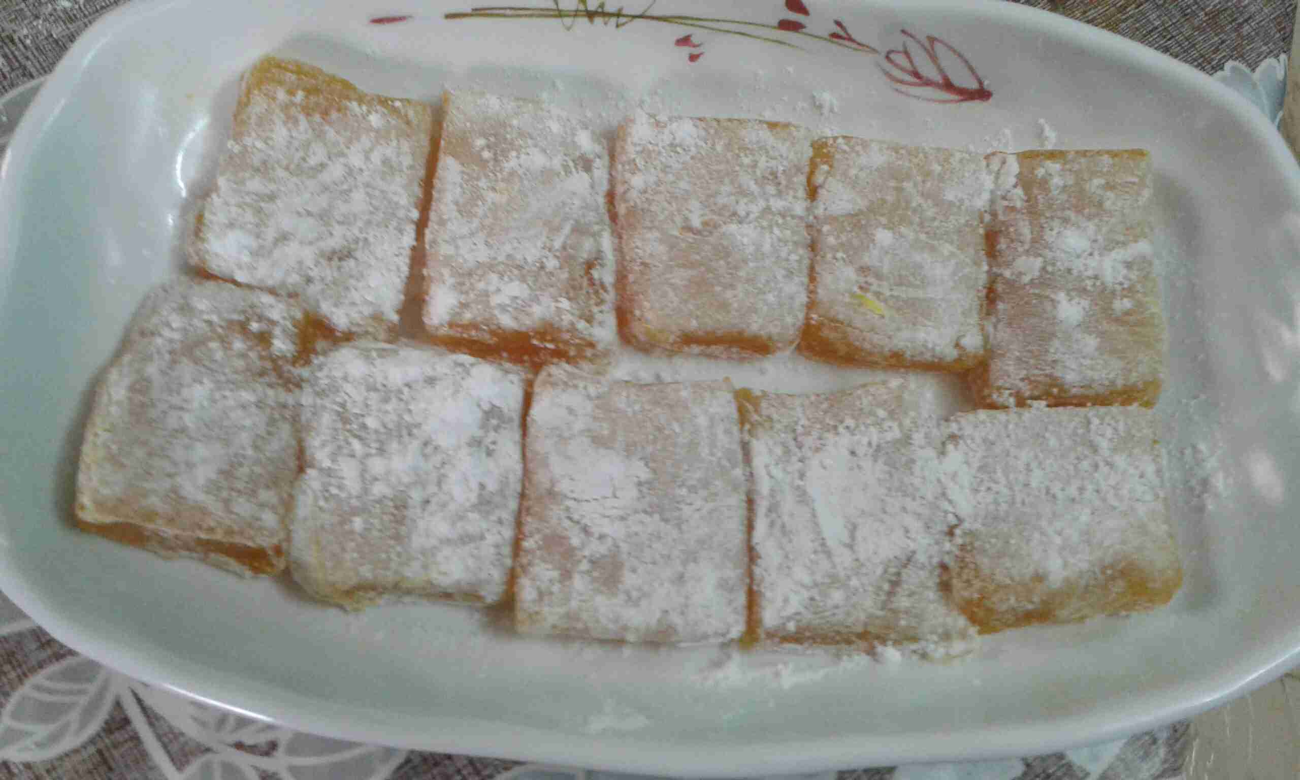 او الزهر او الفنيلا وبتقلبيهم مزبوط وبطفي الغازبتكوني محضره بايركس صغير مفرود في قاعه كميه من النشا وبتوضعي الخليط وبتسويه بمعلقه مدهونه بالزيت وبتتركيه يبرد في الاجواء العاديه من ساعه لساعتين حسب ما يجمد وترشي فوقه النشا وبتقطعيه وبتقدميه والف صحه وهنا