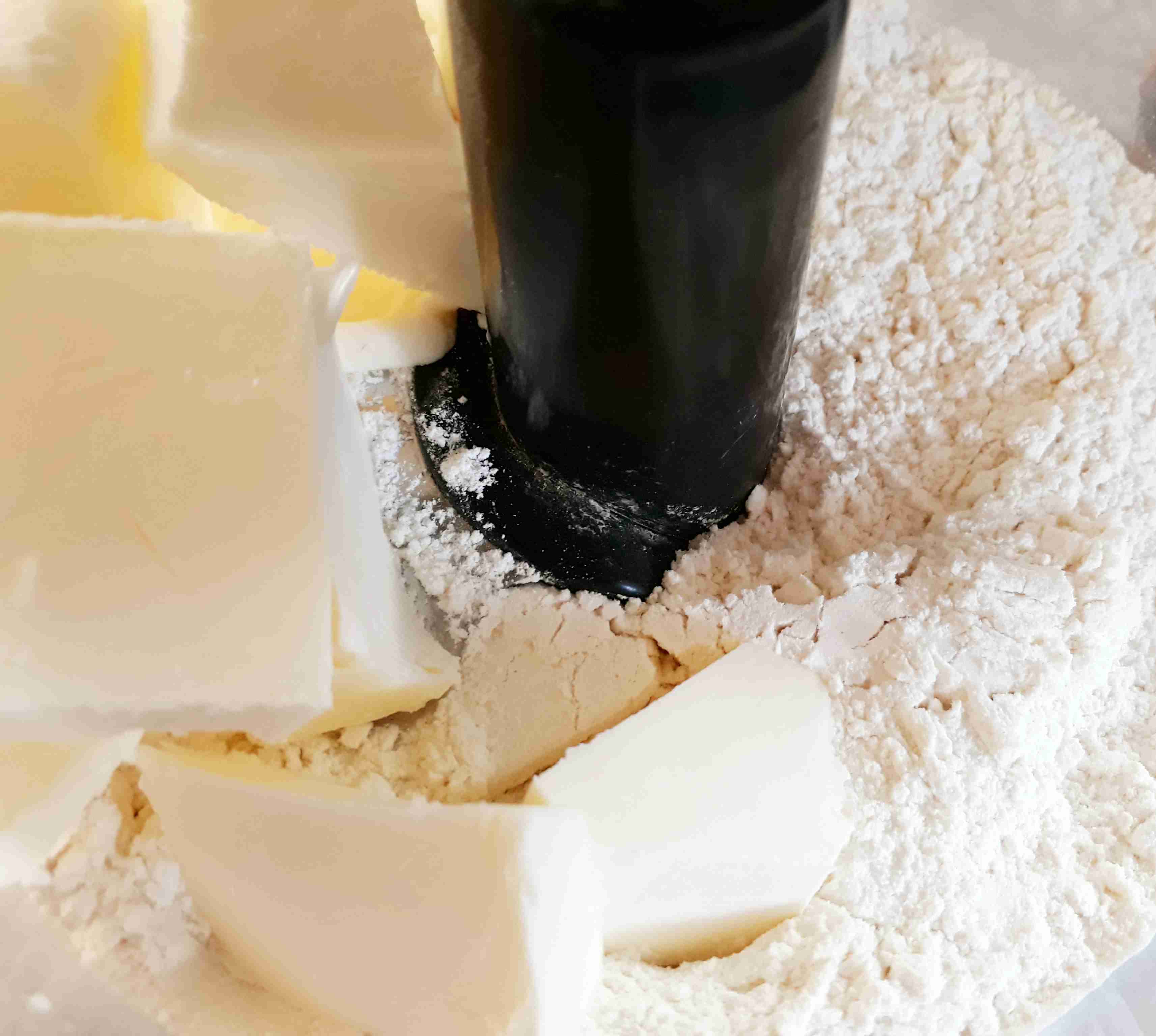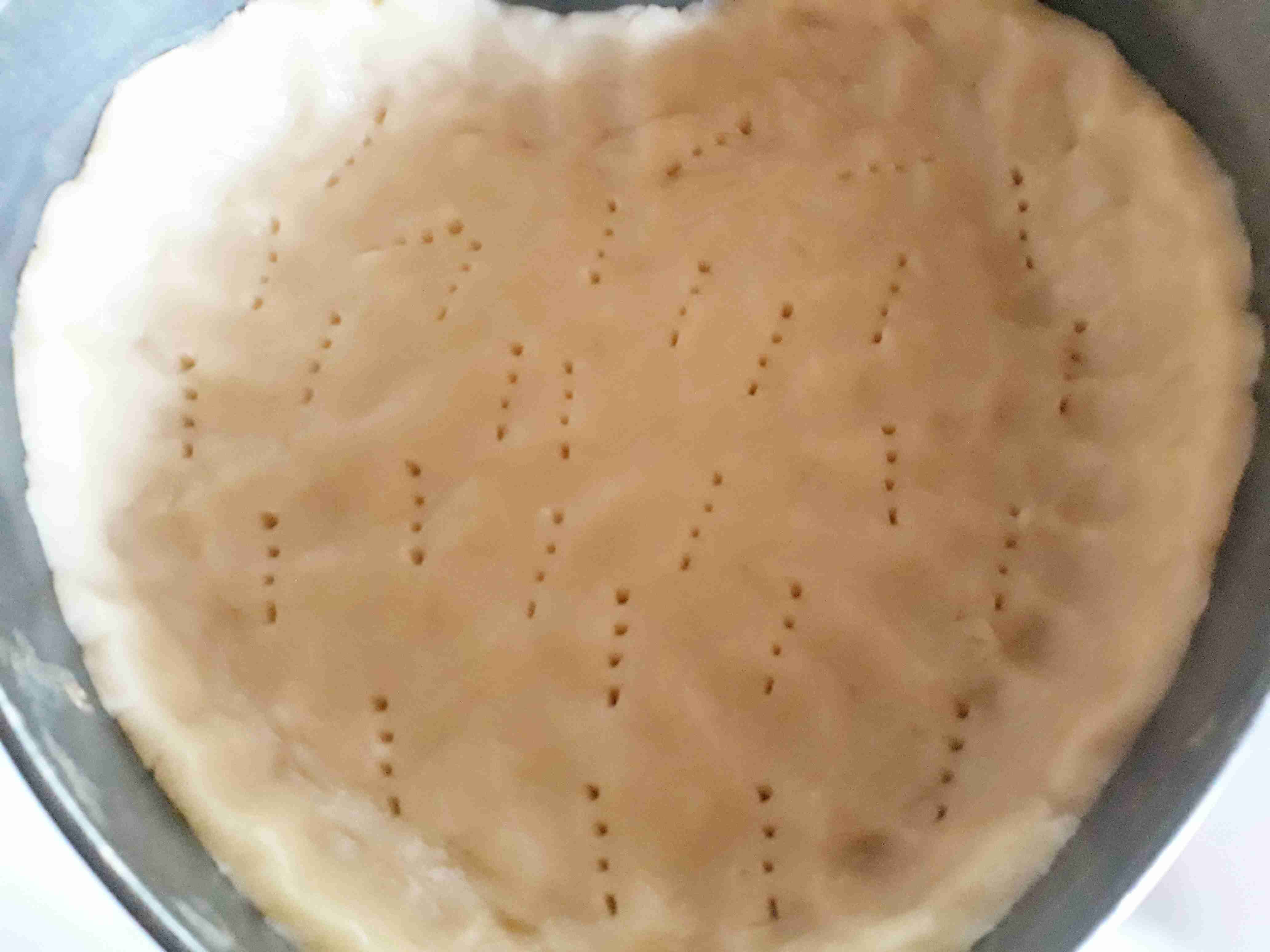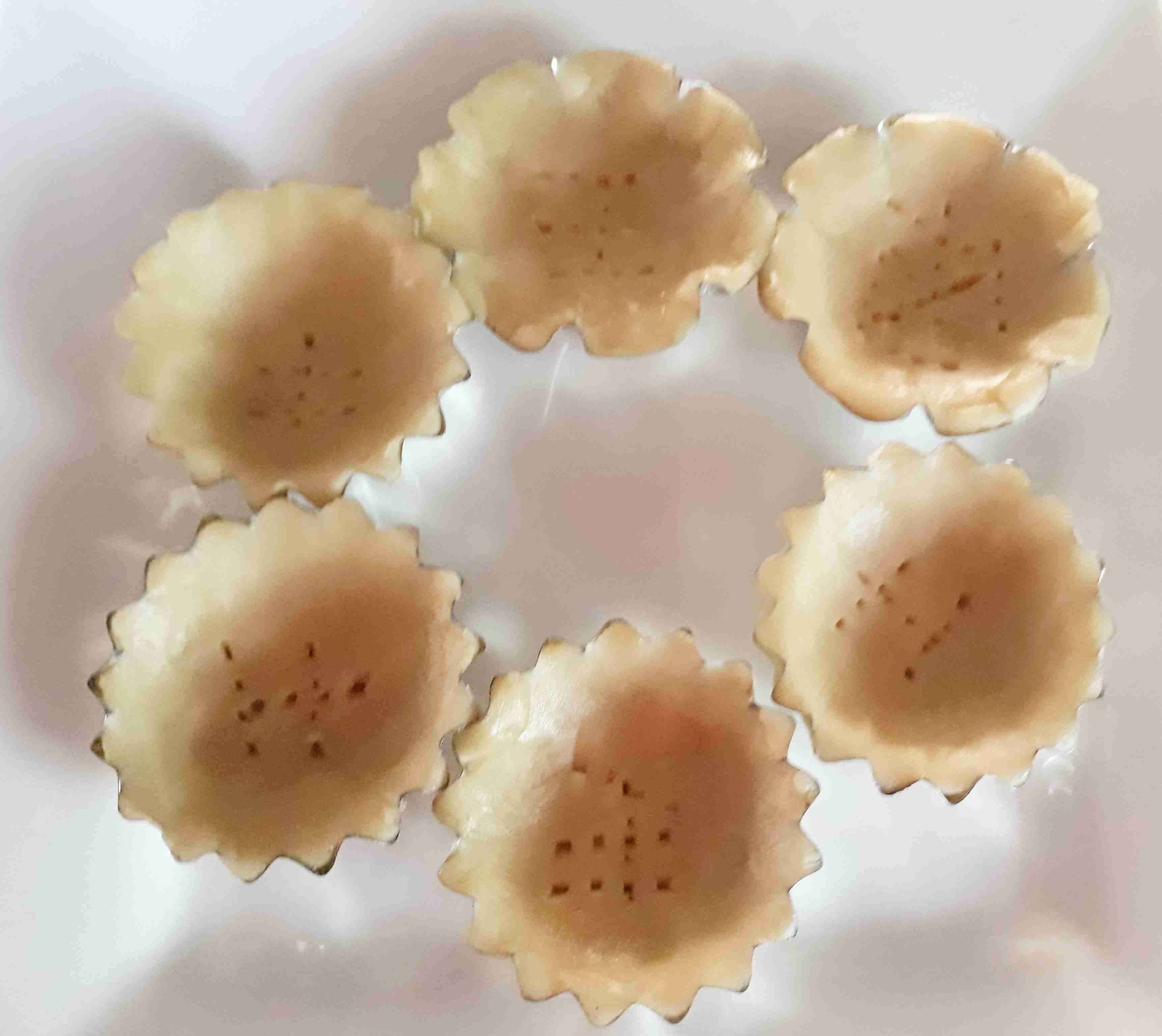 بمحضره الطعام بنضع الطين والزبده البارده وبنشغلها لما يتشكل عنا خليط مثل الرمل وبعد هيك بنضيف الفانيلا وصفار البيض ورشه الملح وبنشغل الخلاط لفه خفيفه يا دوب يمتزجو ما بدنا نعجنهم بس مجرد يلتمو كل المكونات وبنضيف المي البارده شوي شوي لما تشوف العجينه صارت تلم على بعضها بنكتفي يمكن ما نحتاج كل كميه المي المذكوره طبعا حسب نوع الطحين وبعد هيك بنلم العجينه وبنغلفها وبنتركها ربع ساعه بالثلاجه لترتاح وبعد هيك بنبلش نقطع و نرق العجينه على حسب قوالب التارت الموجوده عناا وبنعمل بوسط قوالب العجينه ثقوب بالشوكه وبنضع ثقاله من حبوب الحمص او افاصوليه داخل القوالب لحتى ما ترتفع عجينه التارت من الوسط اثناء الخبز