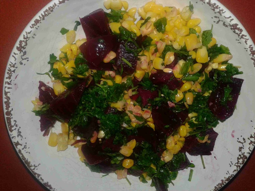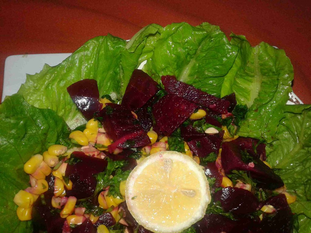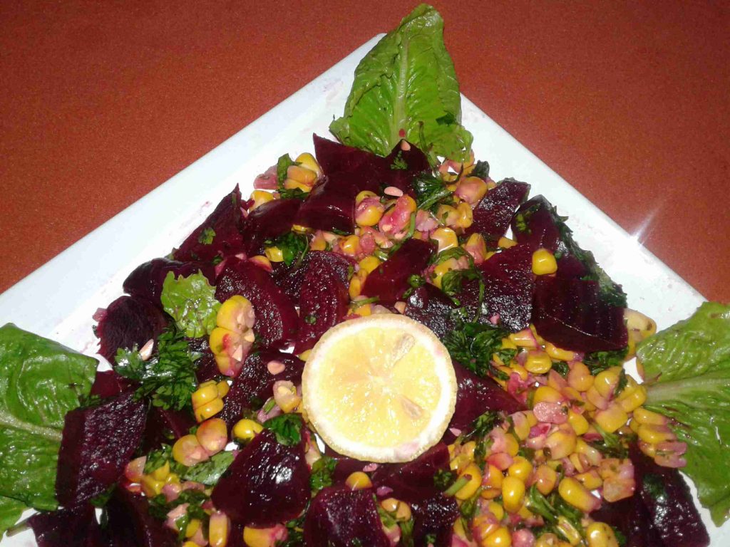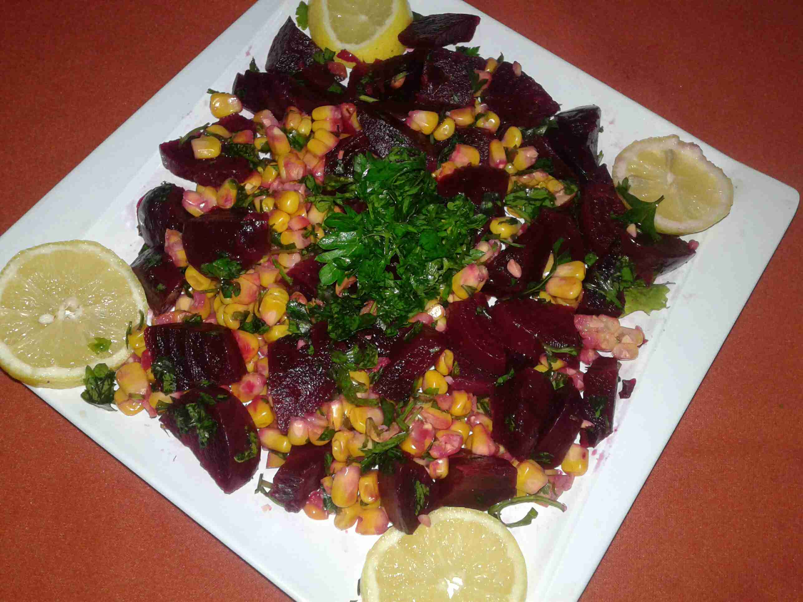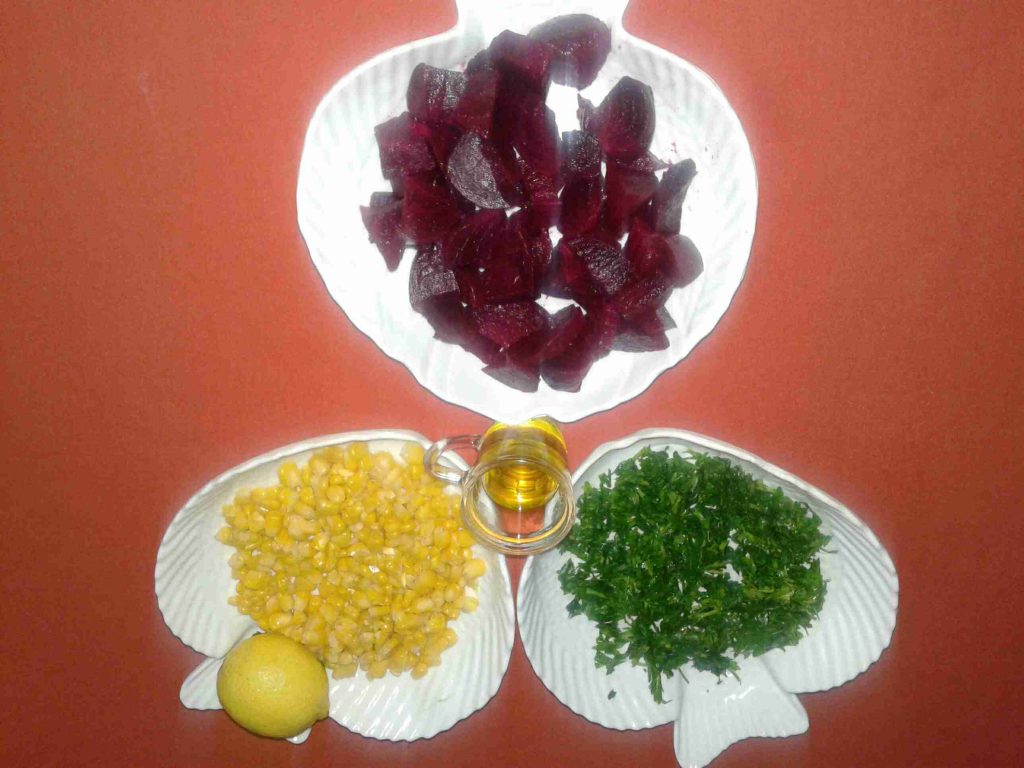 ويلى على المطبخ نشوف الطريقه كيير سهله اوشي طبعا غسلنا الشمندر مزبوط عدة مرات وغلينا الماء بطنجره وضعنا الشمندر فيها بده نصف ساعه وبعد هيك بنطلعو من المي وبنقشره وبنقطعه مكعبان وبنضيفله الذره والبقدونس واليمون والملح وشوية مي من مية السلق