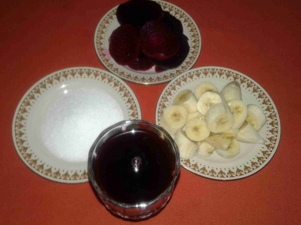 بنحضر الخلاط اولا ونضع به كوب من ماء سلق الشمندر ونقطع ثلاث حبات من الموزوكوب من الشمندر المقطع مكعبات وكاستين ماء وممكن استبدالهما بعصير البرتقال والسكر حسب الرغبه وبنشغل الخلاط وبحصل على كوكتيل روعه وذات فائده عظيمه وبنقدمه والف صحه وهنا