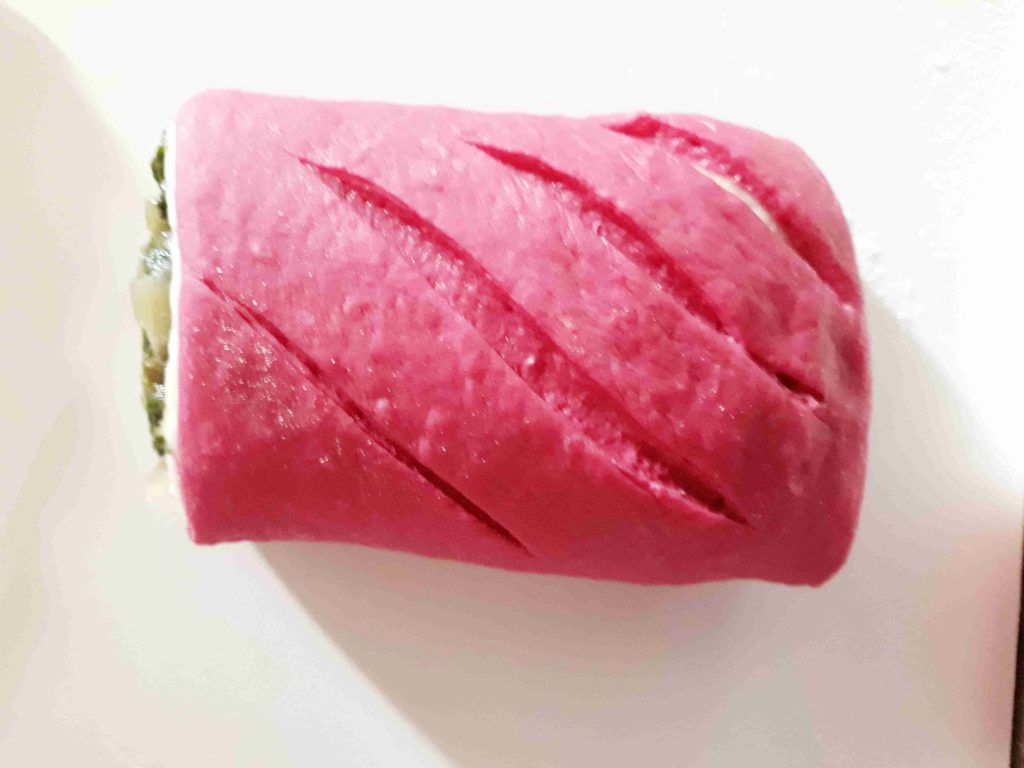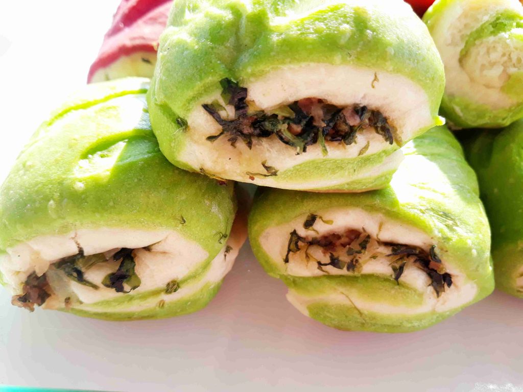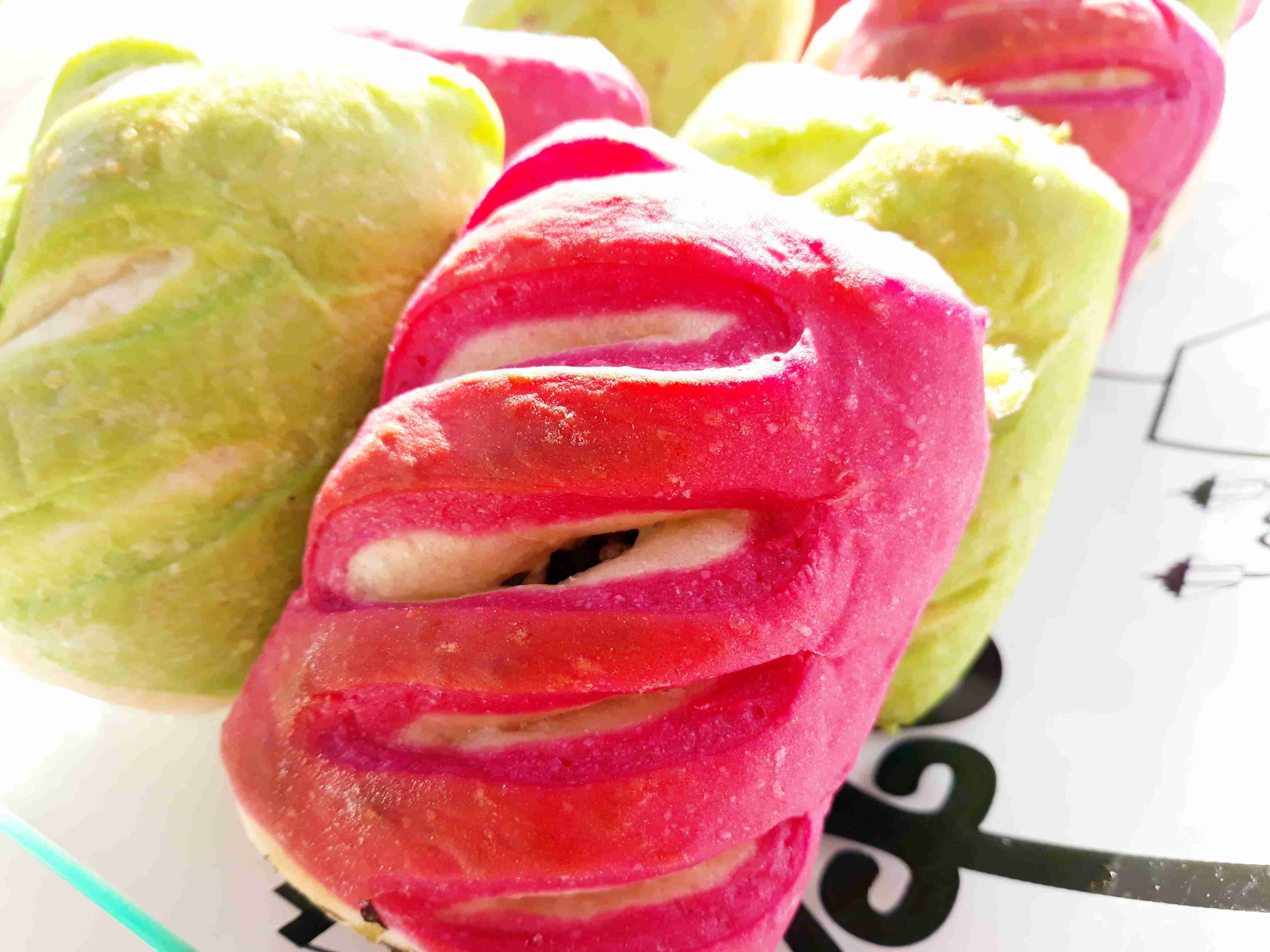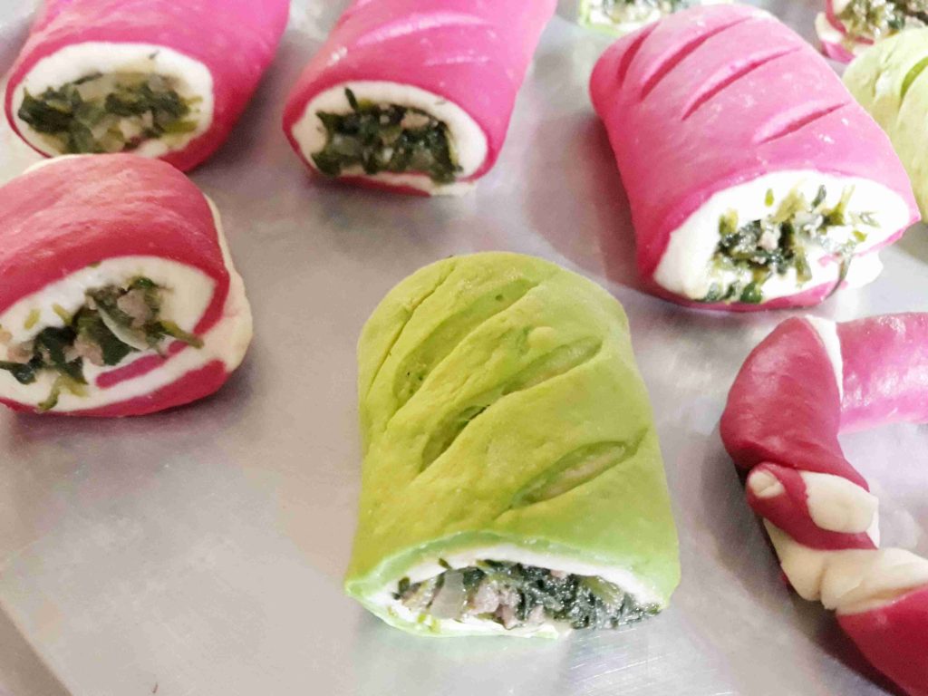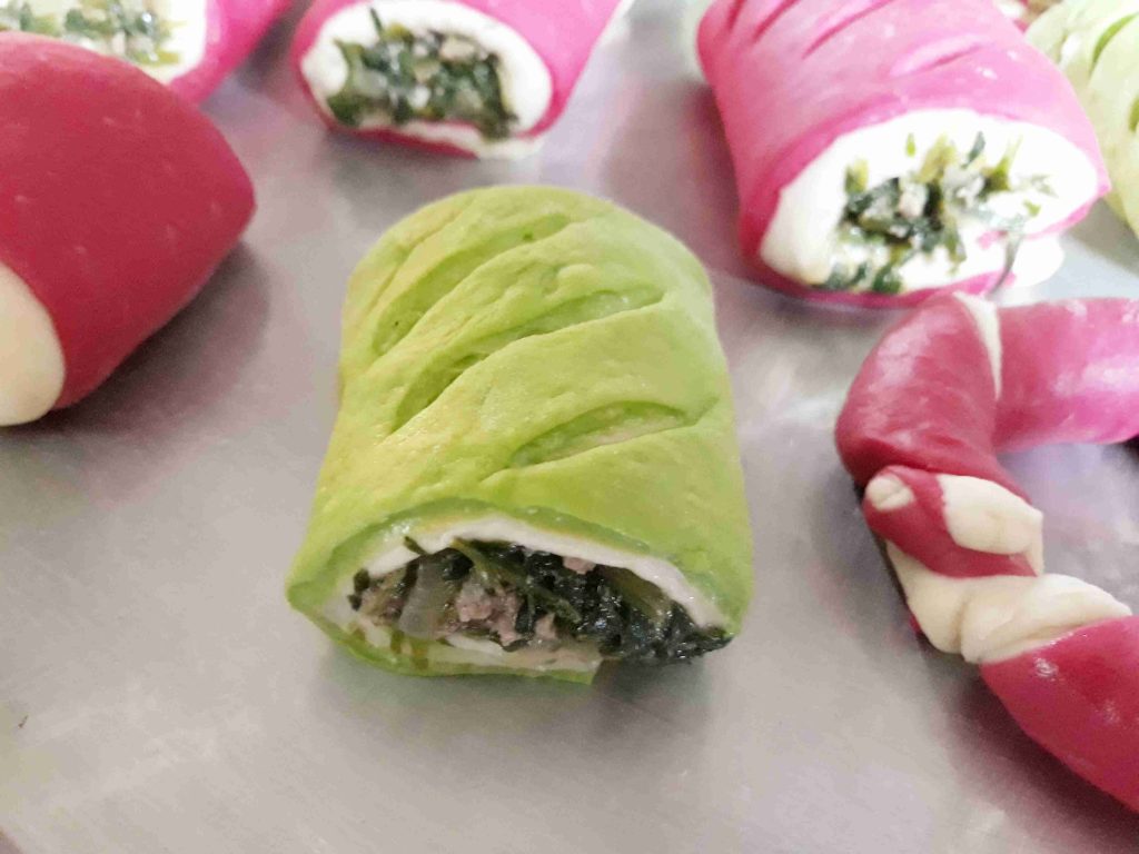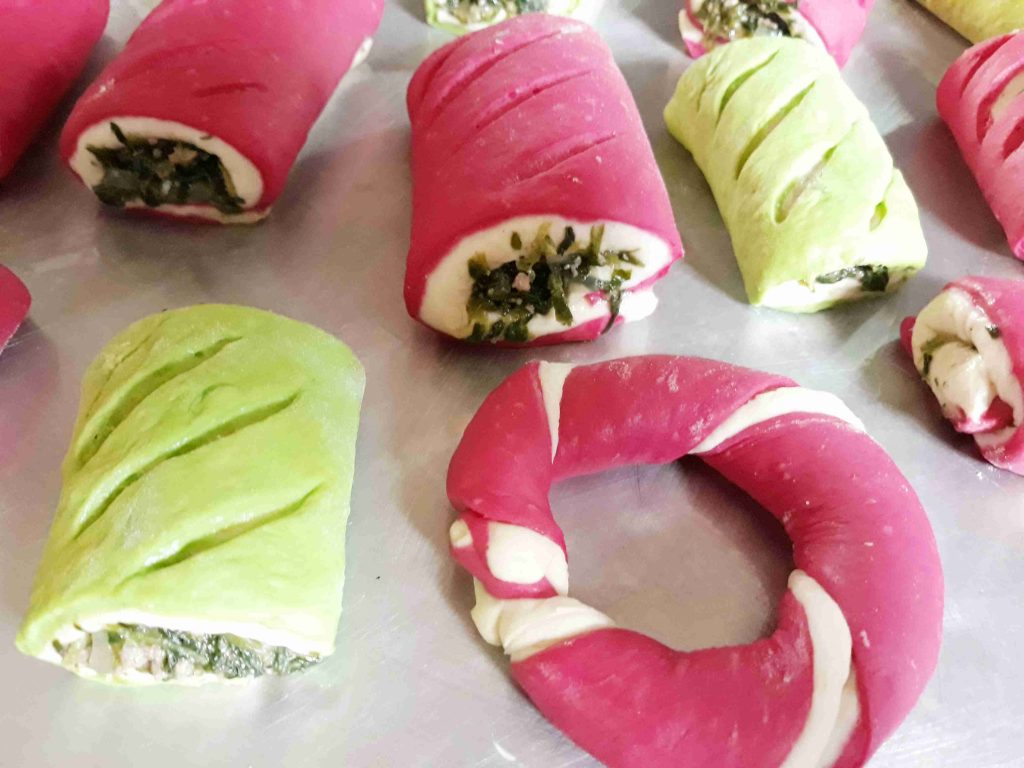 بعد متكون اختمرت العجينه وبنكون جهزنا الحشوه وبردت و بنقطع العجينه لقطع متساويه وبنرقها شكل مستطيل بنضع العجينه الملونه تحت وبنضع العجينه البيضه فوق وبنضع الحشوه فوقها وبنشكل العجينه وبنقطعها بالسكين وبنصفها بصينيه مدهونه قليل من الزيت وبنعمل شقوق على وجه العجينه وبندهنها بخليط التلميع وبنخبزها بالفرن على نار اكثر من متوسطه لما تستوي وتوخذ لون احمرار ذهبي وخفيف