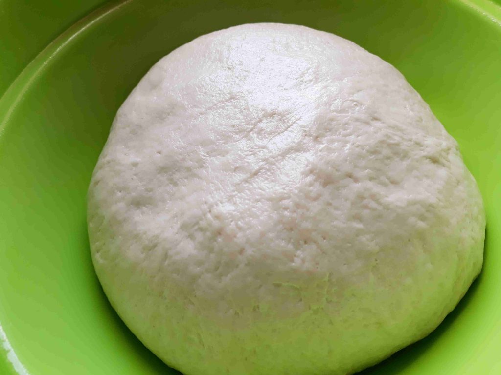 3 كوب طحين ومعلقه كبيره خميره ومعلقه كبيره سكر ومعلقه صغيره ملح وربع كوب زيت ومعلقه كبيره خل بنخلط المقادير الجافه مع بعض وبعد هيك بنعجن العجينه كثير منيح مع اضافه كوب وربع من الماء الدافي وبعد هيك بنضيف الزيت وبنستمر بالعجن لما تسير عنا عجينه طريه ومتماسكه بنتركها تخمر نص ساعه