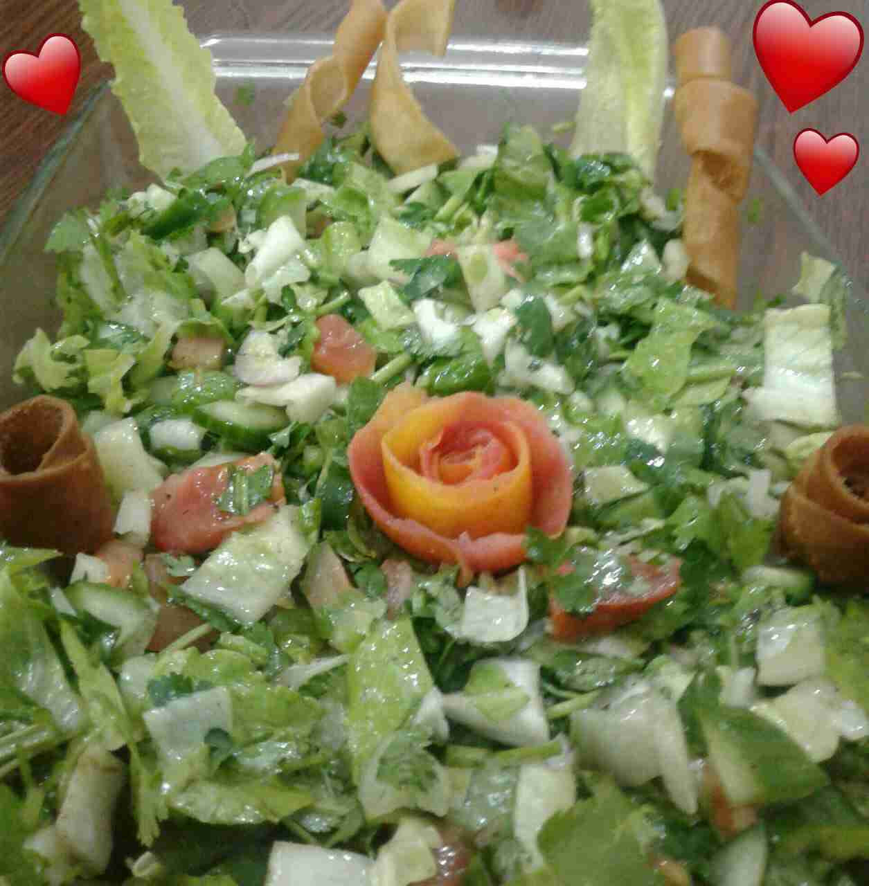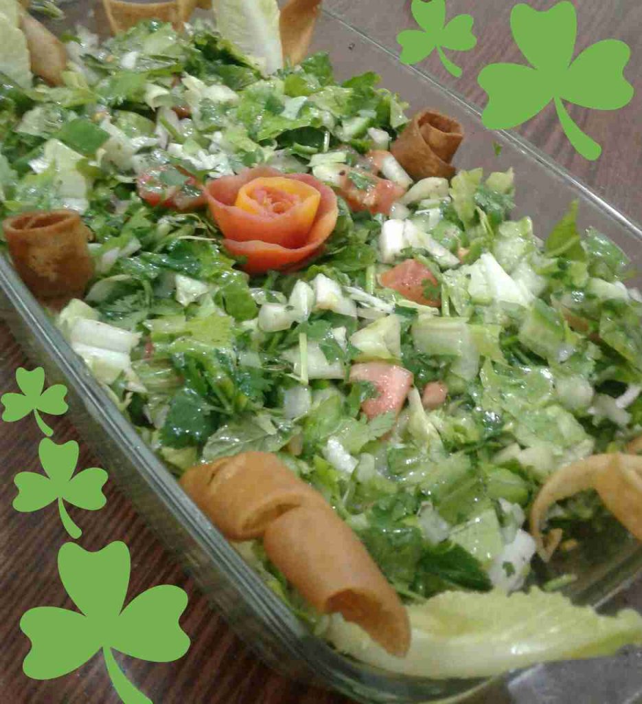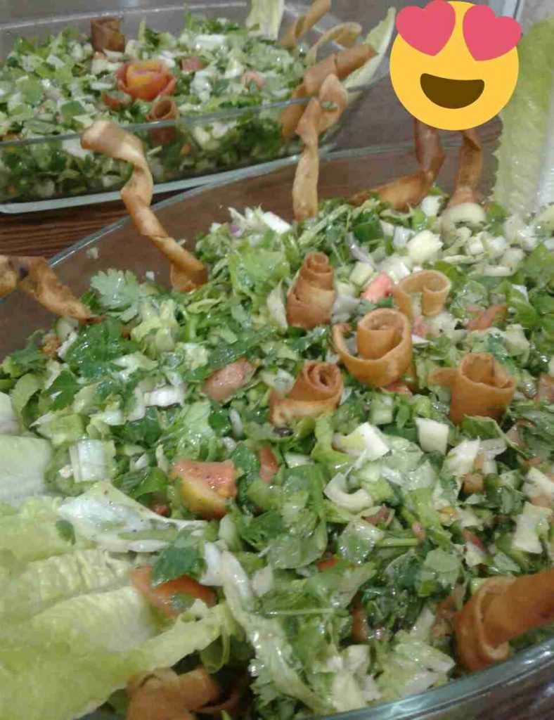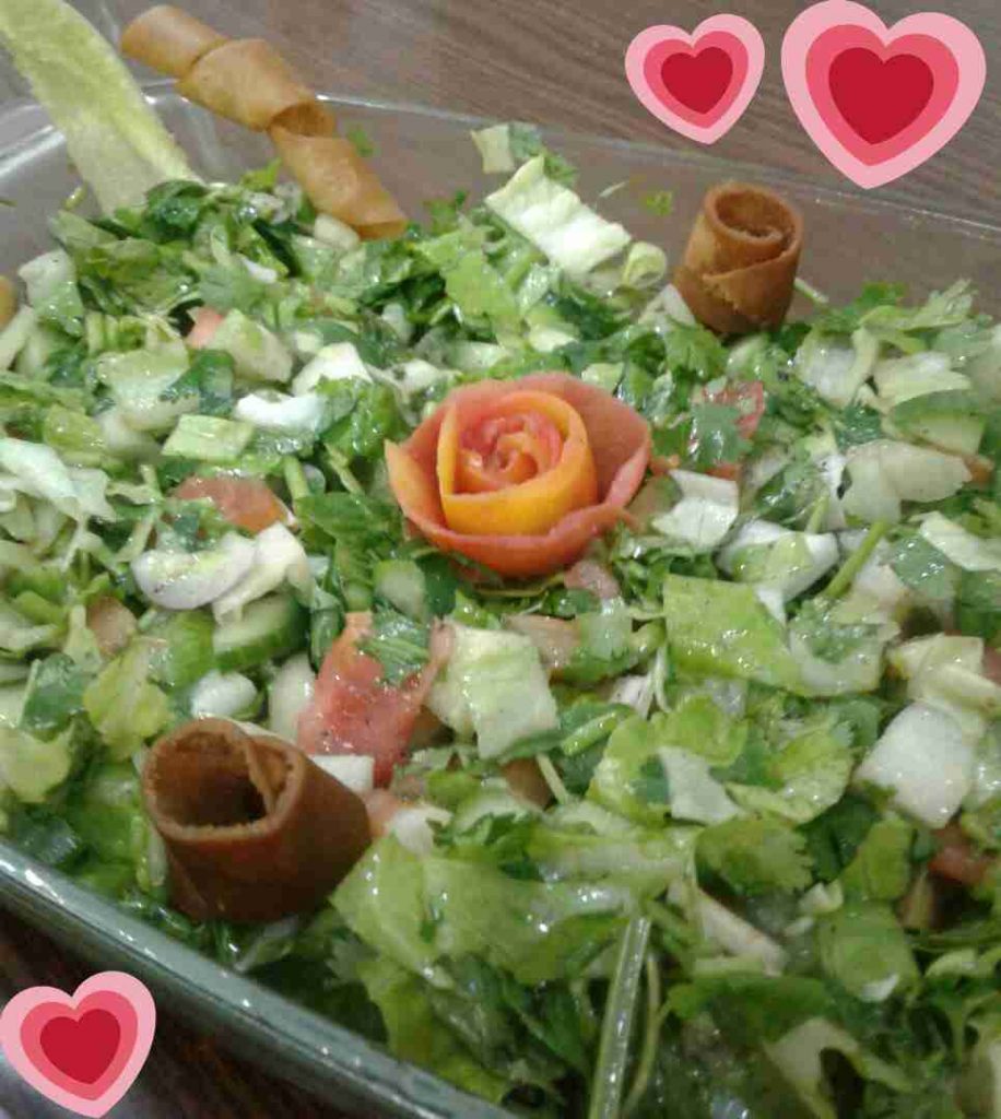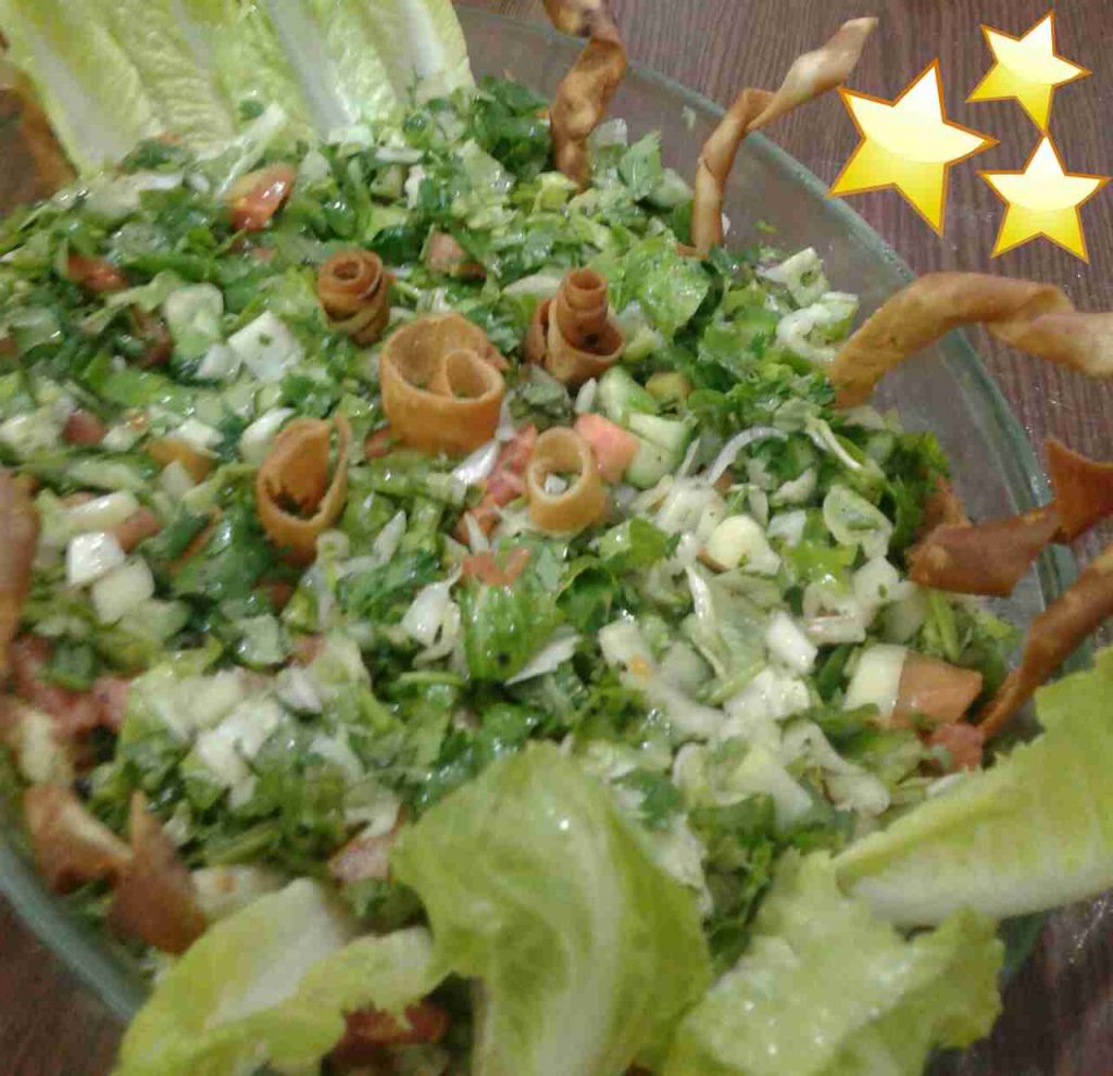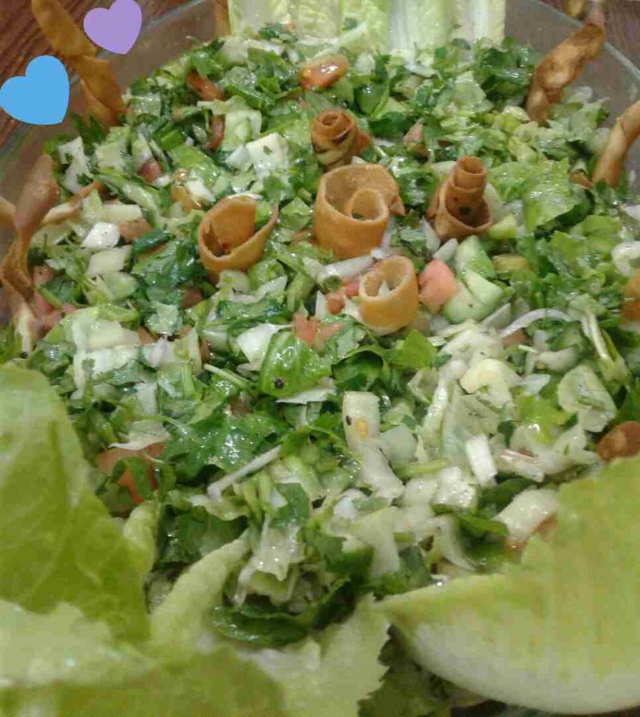 نقطع الخضار بالحجم المرغوب فيه ، ونصنع صلصة مكونة من (زيت الزيتون ودبس الرمان وعصير الليمون والملح والسماق) ونصعها فوق الخضار ونقلب ، ونزينها بالخبز المقلي .