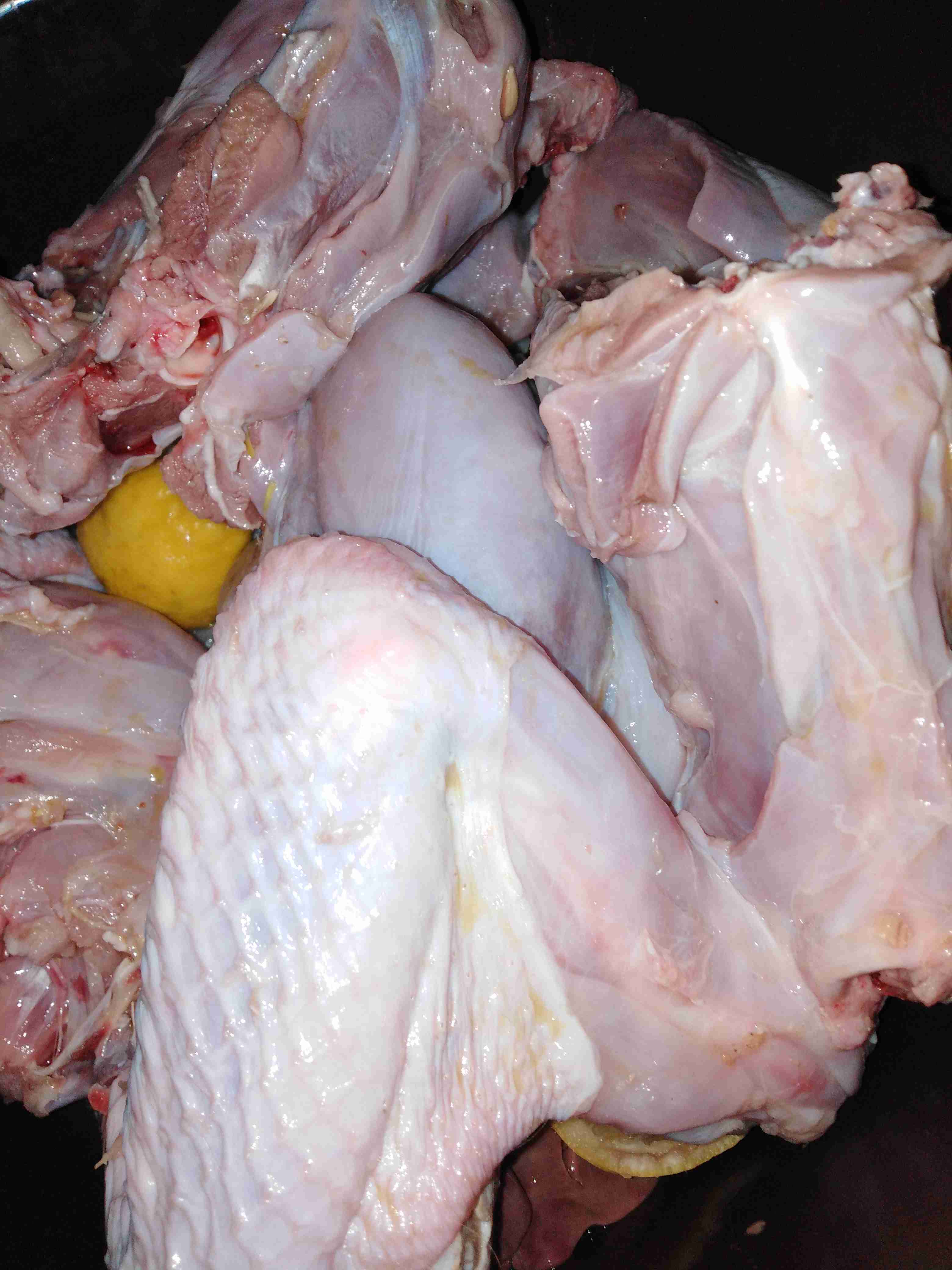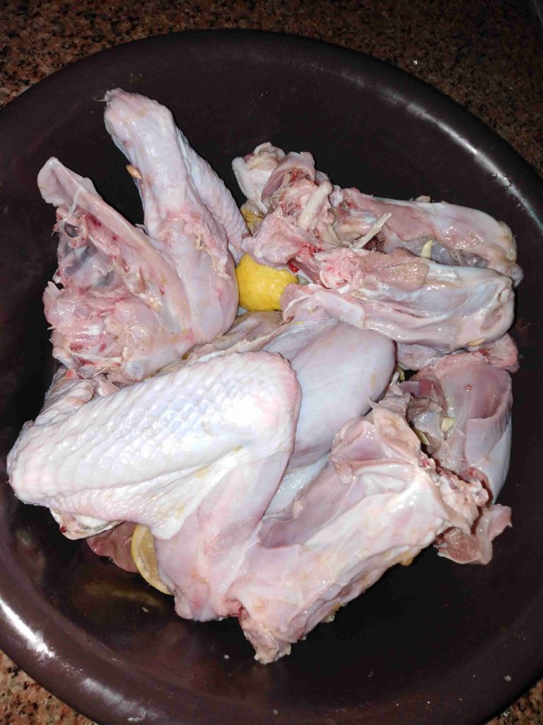 ننقع الدجاجه بلماء والخل مدة ساعه ثم نقوم بغسلها تحت الماء الجاري