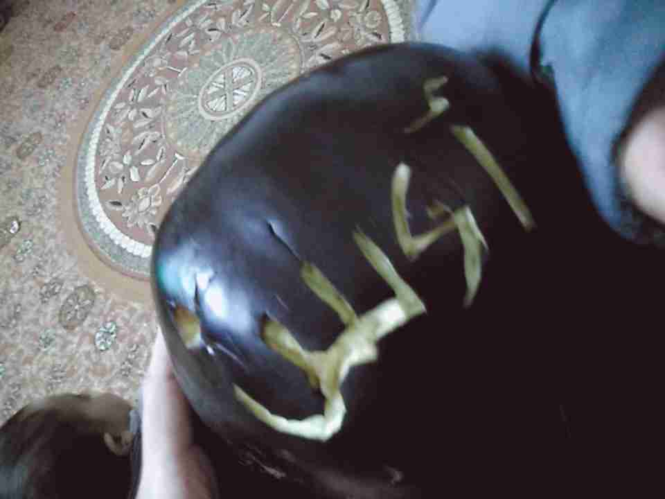نقشر الباذنجان ونقليه ثم نقوم بوضعه ع فاين ليتصفى الزيت