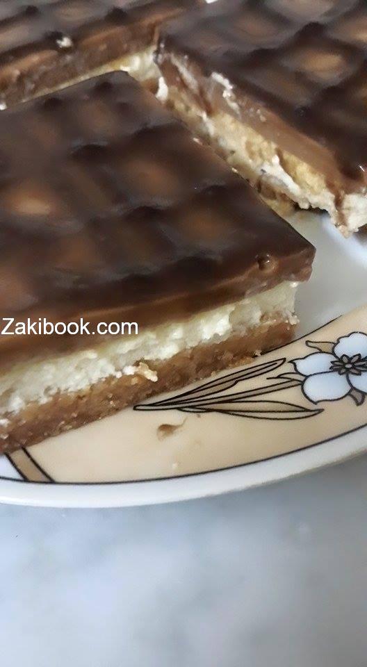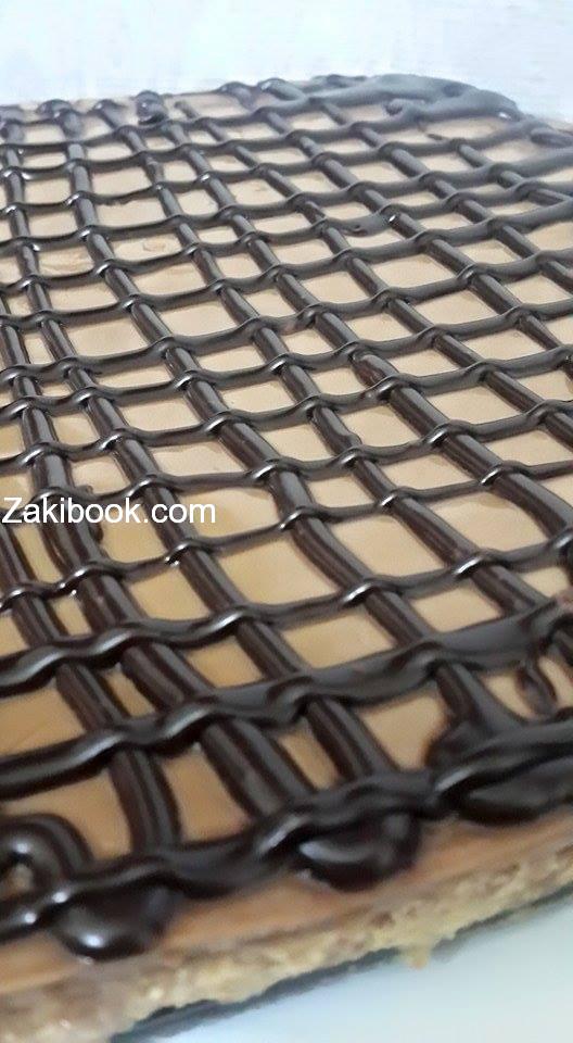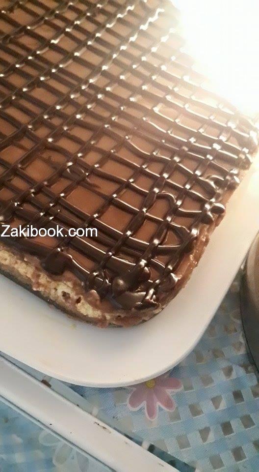 ظرف كريم كراميل كاسه ونص حليب سايل مع 2 ملعقه كاكاو وع نار لحتى يغلي وبس يفتر نحطه بحذر ع طبقه التانيه وع التلاجه وزينته كاكاو خام ذوبته بقمع الحلويات عملت خطوط طولي وعرضي وبالعافيه يا حلوين