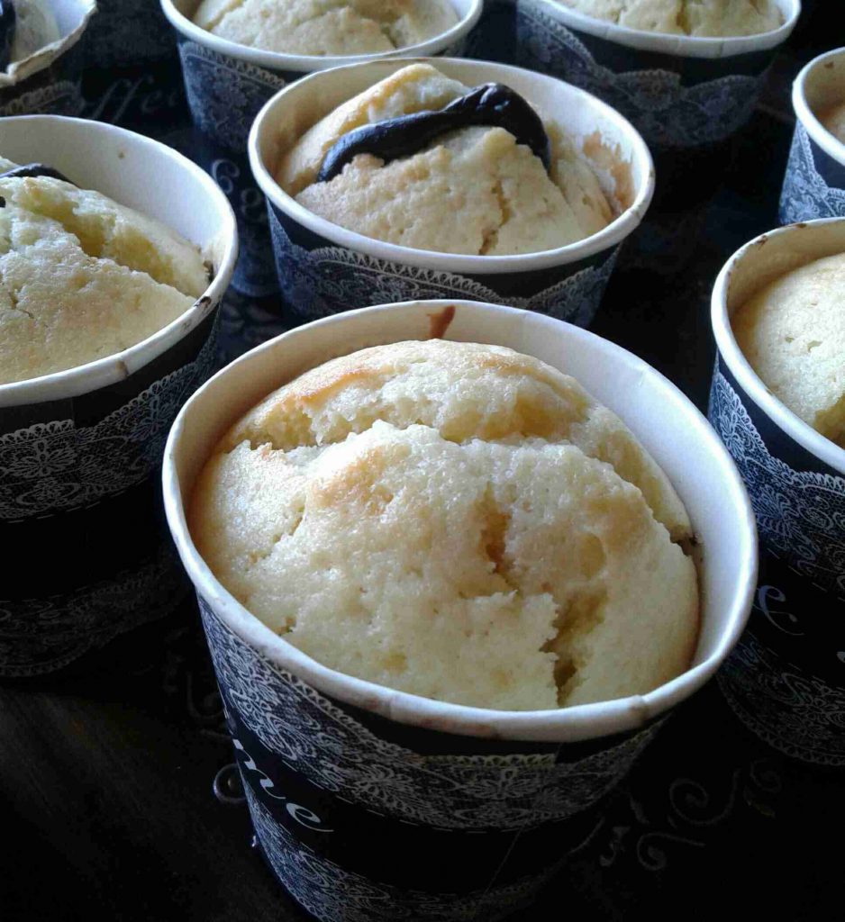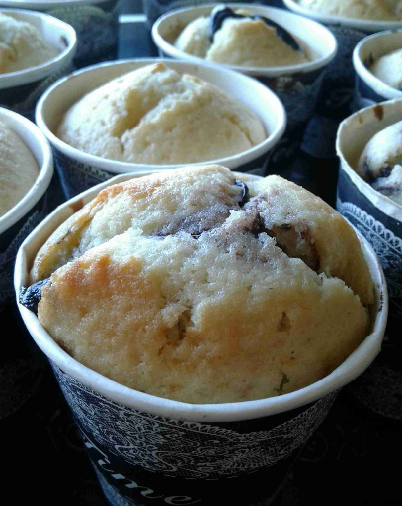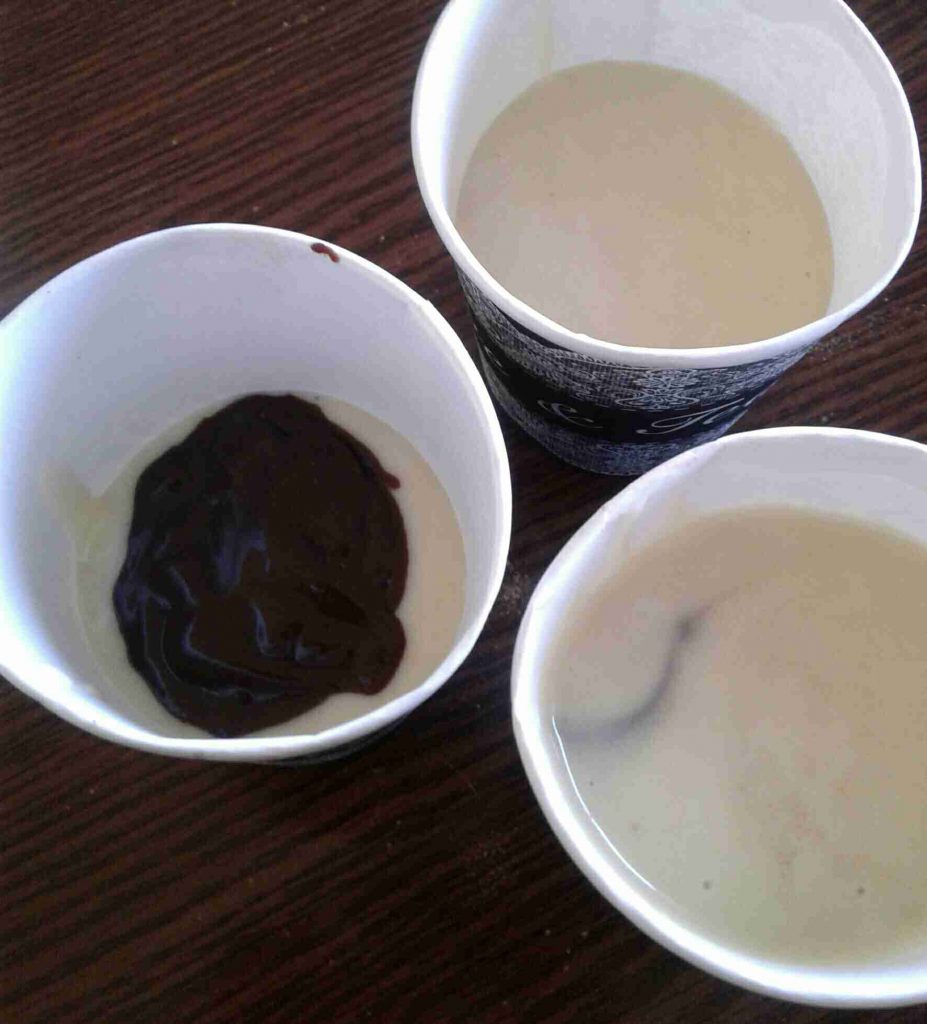 – نحضر الأكواب الورقية ونسكب فيها من خيط الكيك بمقدار ملعقة تقريبا ، ثم ملعقة من صلصة الشولولاتة فوقها بحيث تكون في النصف ، ثم ملعقة من الكيك ، وهكذا ….