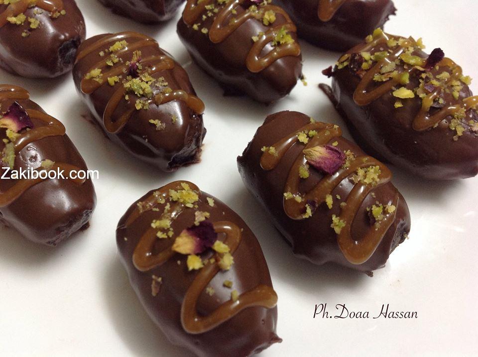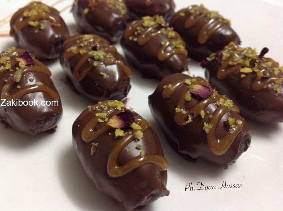 جبت تمر شلت منه النواية وشلت القشرة الي مغلفاه مشان يطلع الشكل مرتب وحلو وحشيته كيك مفتفت وتوفي ومكسرات وسكرته وسويته بيدي بحيث يكون ما في تعرجات مشان الشكل يطلع مرتب وسيحت شكولاتة عحمام مائي وغلفته فيها وبس كدا ^^