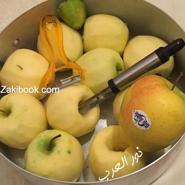 وتخلطي كوب سكر مع كوبين ماء وتصبيهن على التفاح وتحطيه على النار وحاولي تقلبيه بشويش لانه الجزء اللي تحت يستوي فانتي قلبيه