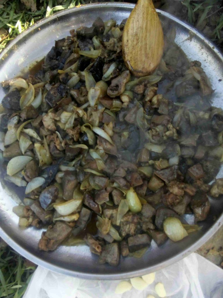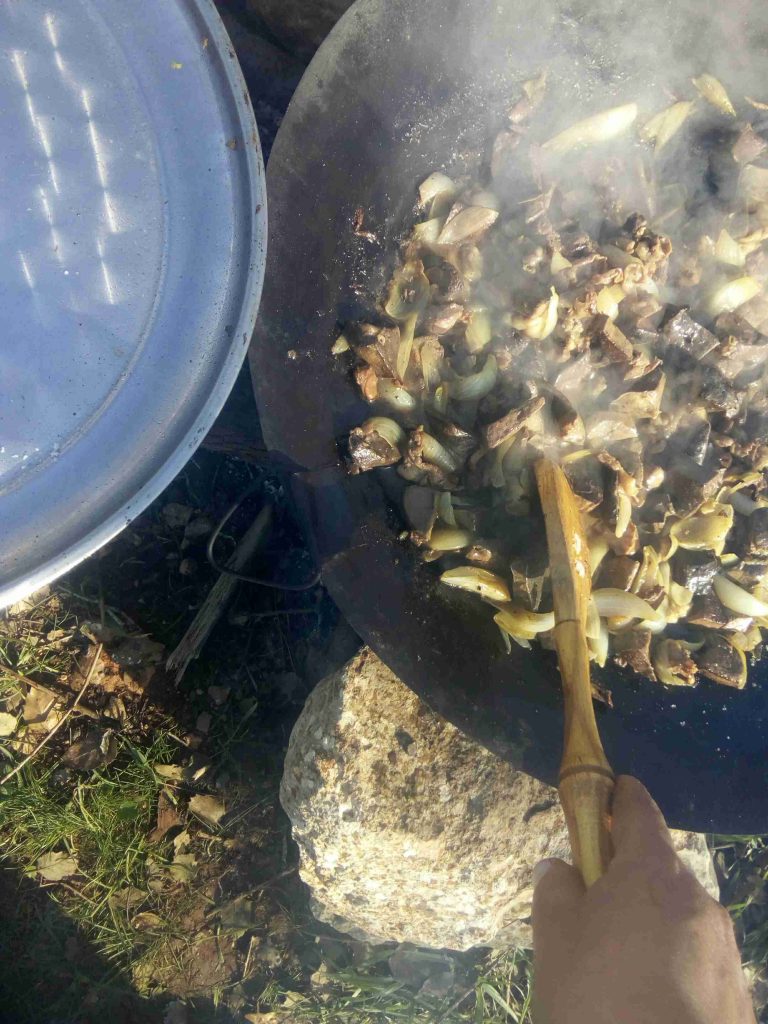 بنقطع المعلاق وبنحط الصاج لنعمل الصاجية على الحطب بنحط المعلاق مع اللية وشوية زيت ومي وبنقلبهم شوي بعدين بنقطع البصل جوانح وبنحطه وبنقلب وبنضيف مي إذا أحتاج وبنغطيه ليستوي بنقدمه مع اللبن كتيييير لذيذ
