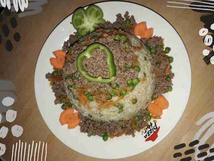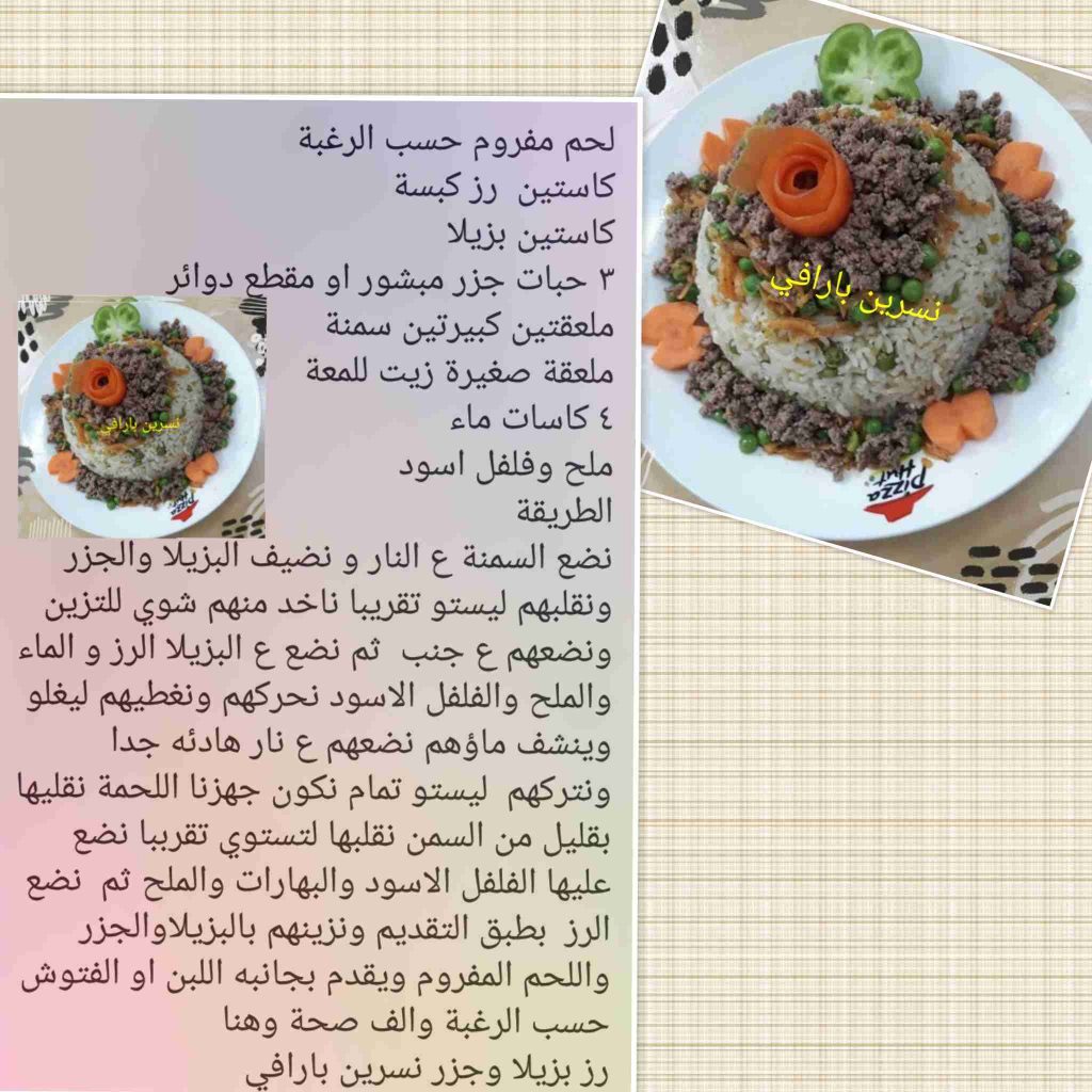 نضع السمنة ع النار و نضيف البزيلا والجزر ونقلبهم ليستو تقريبا ناخد منهم شوي للتزين ونضعهم ع جنب ثم نضع ع البزيلا الرز و الماء والملح والفلفل الاسود نحركهم ونغطيهم ليغلو وينشف ماؤهم نضعهم ع نار هادئه جدا ونتركهم ليستو تمام نكون جهزنا اللحمة نقليها بقليل من السمن نقلبها لتستوي تقرببا نضع عليها الفلفل الاسود والبهارات والملح ثم نضع الرز بطبق التقديم ونزينهم بالبزيلاوالجزر واللحم المفروم ويقدم بجانبه اللبن او الفتوش حسب الرغبة والف صحة وهنا