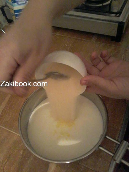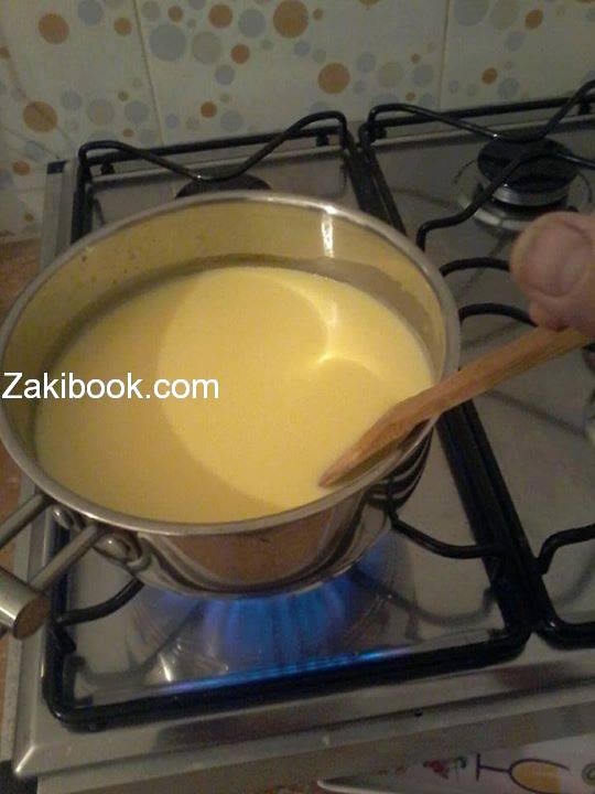 وتاخدي الكريم كرميل دوبيه فالحليب مع سكر وحطيه عالنار يغلي شوي طفي النار و خليه لحتى يصير دافي