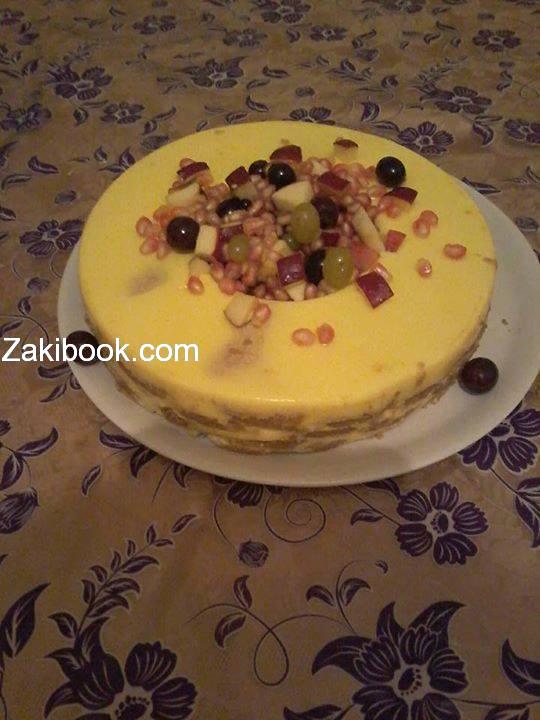 وصبيه على البسكوت والموز ودخليه التلاجة يجمد كتير منيح بعدها زيني باي نوع فواكي يعجبك