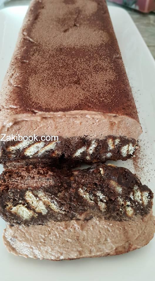 بعدين بنكسر باكيت بسكوت بنغلف قالب مستطيل بنايلون وبنحط, الخليط وبنغطي وعالفريزر ليجمد كم ساعة بعدين بنفكو من النايلون.