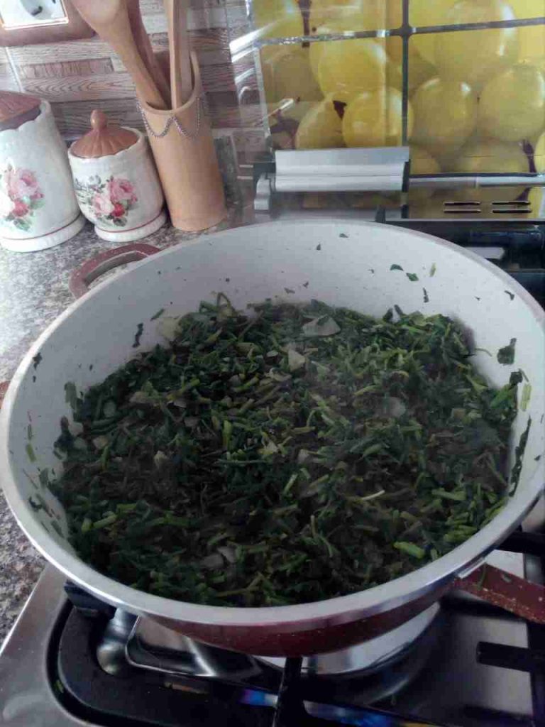 نفرم البصل ونقليها بزيت الزيتون ونضيف عليها الخبيزه ونقلبها ع نار هادئه الي ان تنضج