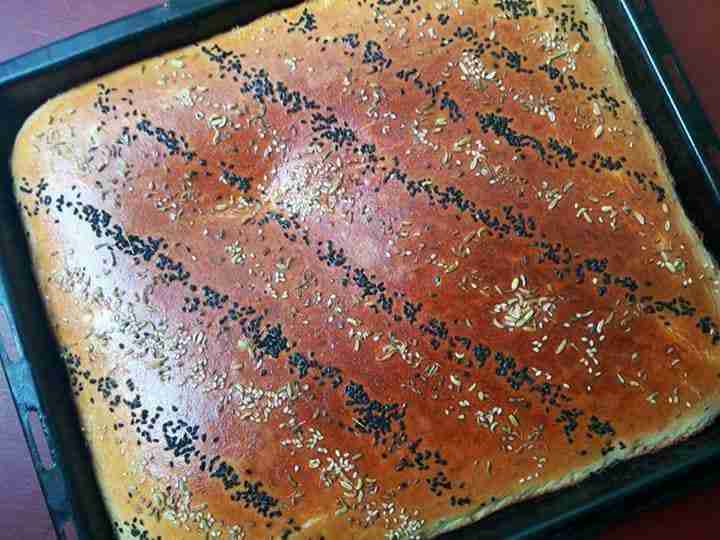 -من جهه نحط خميرة وسكر ونذوبهم شوي بالماء دافي ونخلط كلشي ونصب الماء ونلم نتحصل على عجين طري وفي نفس الوقت متماسك نغطيه ونخليه يرتاح ربع ساعه بعد نعجن مليح مليح حتى يعود يطلق في فقاعات الهواء هذاك الوقت نحضر شوي ماء دافي ونبدا نرش ونكمل نعجن كل مرة يشرب نزيد الماء ونعجن حتى تولي عجين رخو ومتلاصق ندهن اناء عميق بالزيت ونحط لعجينه ونغطيها ونخليها تخمر مليح مليح نزللها لخمور ..ندهن صينية الفرن بالزيت ونحط فيه لعجينه ونبسطها وندهنها بخليط التلميع ونزين بالسانوج والسمسم ونزيد نخليها تخمر وندخلها فرن ساخن على 250 حتى يتحمر