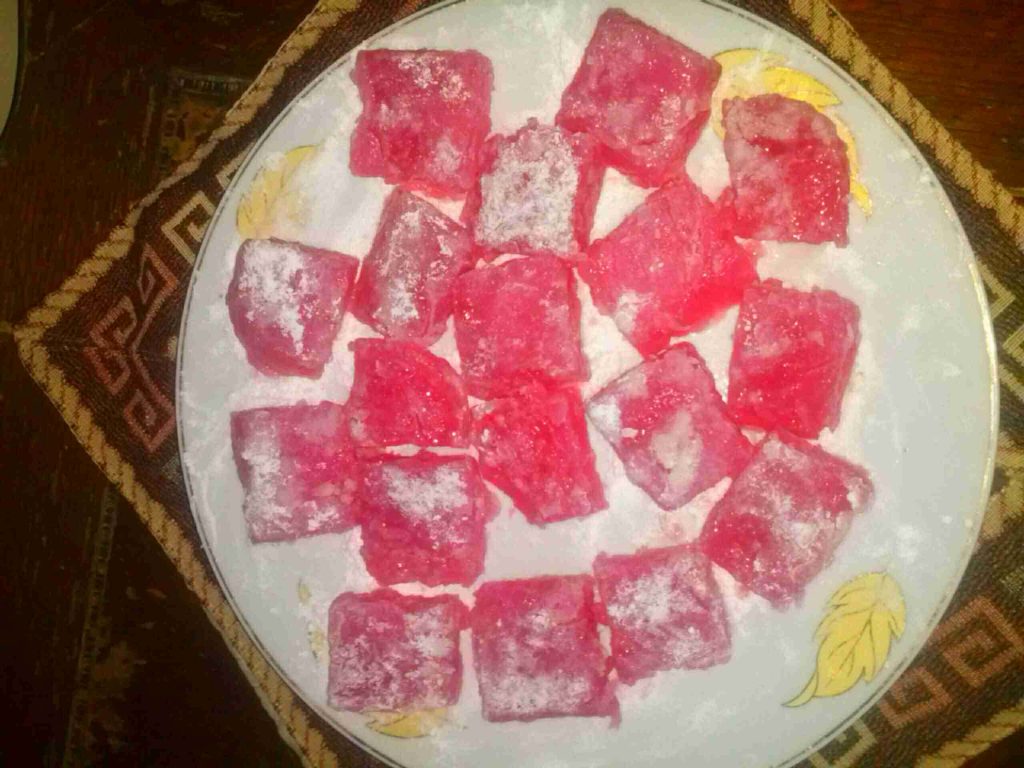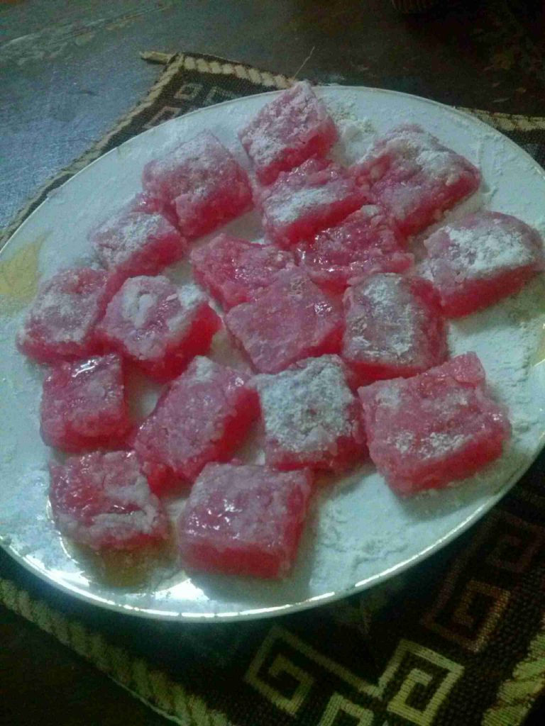 ندوب النشا والسكر مع المي عالناشف بعدين بنحطه عالغاز وبنستمر بالتحريك ونضيف مية الورد والزهر معلقة منهم ونقط من الملون الغذائي بعد ما يجمد ويتجانس بندهن صينية زيت وبنصب الخليط عليه بعد ما تبرد بتقطعها وبنحطها بصحن فيه نشا وبنرش عليها نشا كمان وبتتاكل لحالها وبنجيب كمان بسكوت سادة وبنحط قطعة راحة وبنسكر عليها بقطعة تانية وبنقدمها