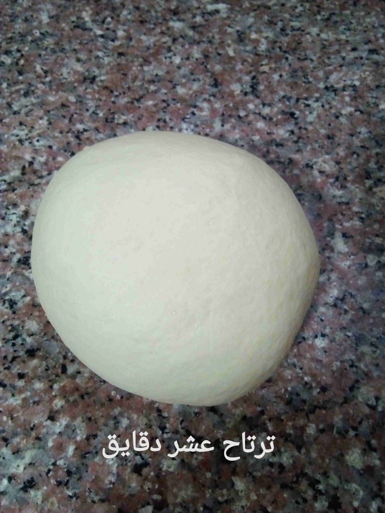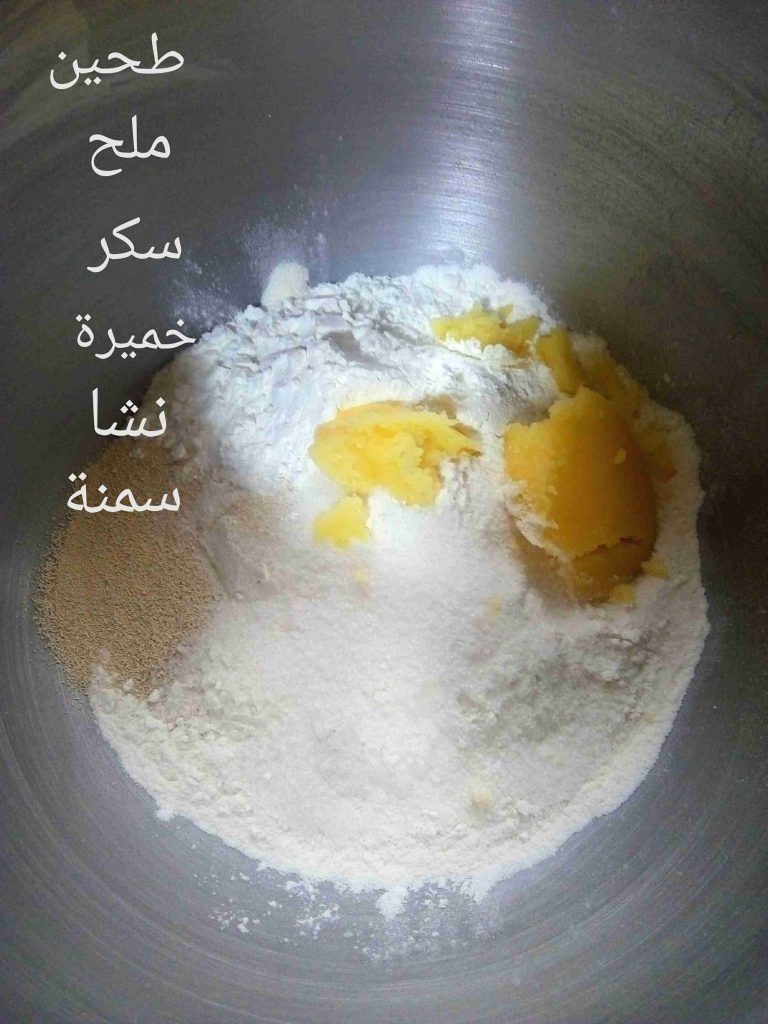بنخلط كل المواد الجافة مع بعض وبنبسهم مع معلقة السمنة وبنضيف المي بالتدريج لانه حسب نوع الطحين بتحتاجي مي بس لنقل كاسة مي انا اخدت مني كاسة الا شوي، بنعجنها مزبوط لحتى نحصل على عجينة متماسكة وملساء بنتركها ترتاح عشر دقايق.