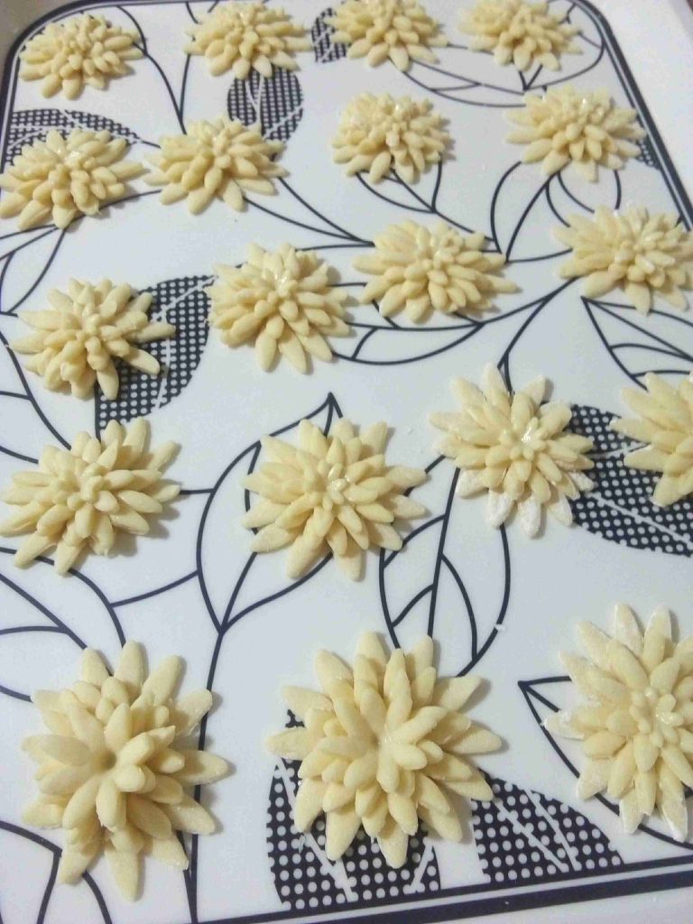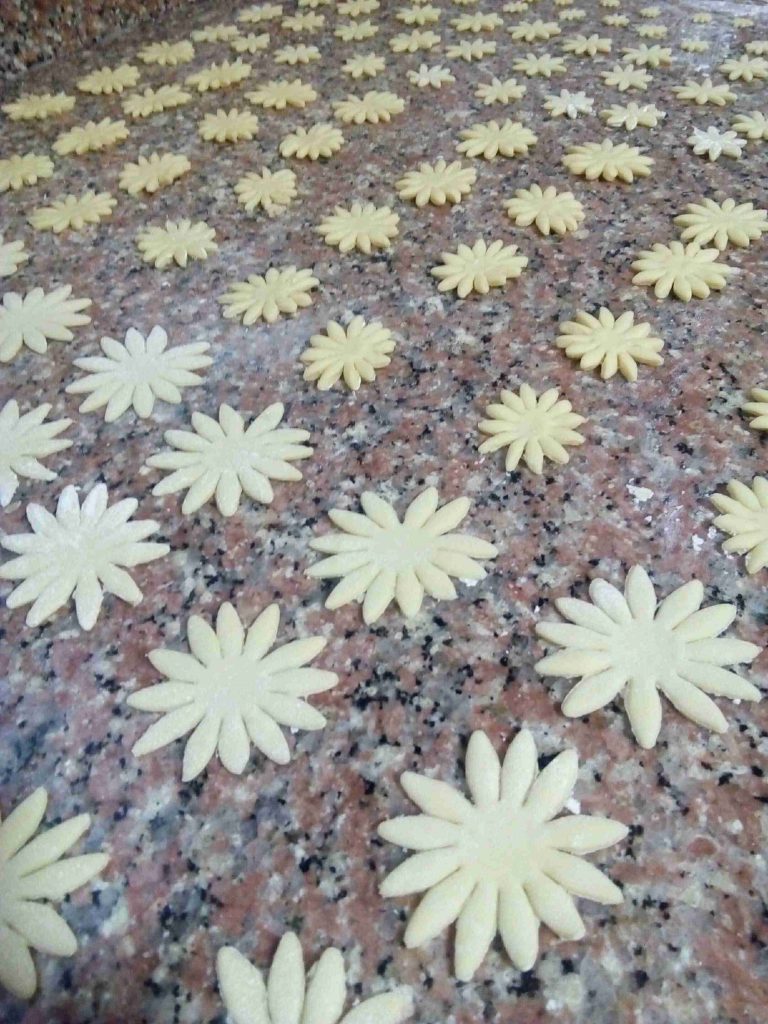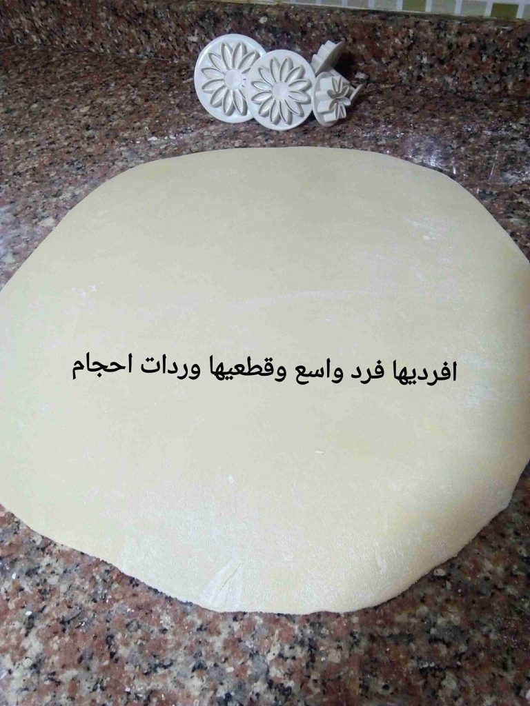 بنرول العجينة على نشا وبنقسمها 3 اقسام وبنفرد كل قسم فرد واسع يعني رققيها منيح وبنحتاج قطاعات ورود احجام متعددة.