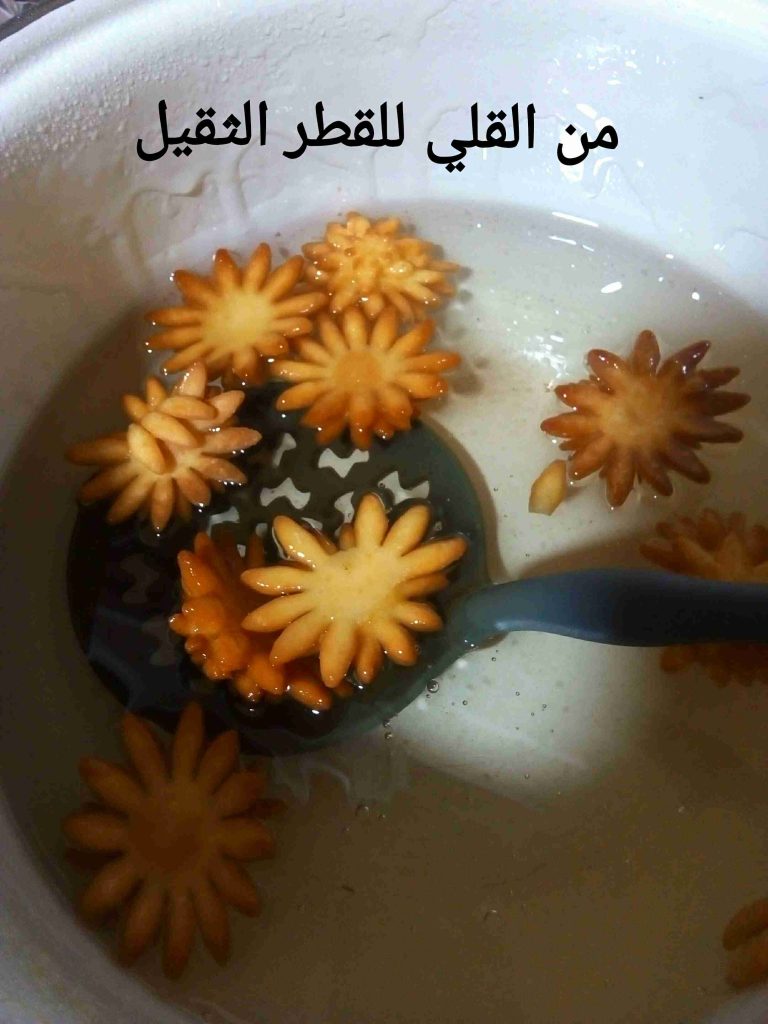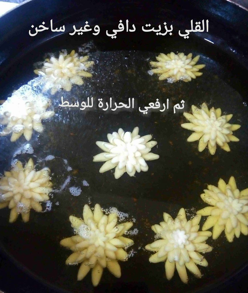 بندفي الزيت عالغاز ما بنسخنه وبنزل فيه الورود بحذر لا تكثري بالقلاية عشان تاخد راحتها ولانها رح تنفش من الخميرة.