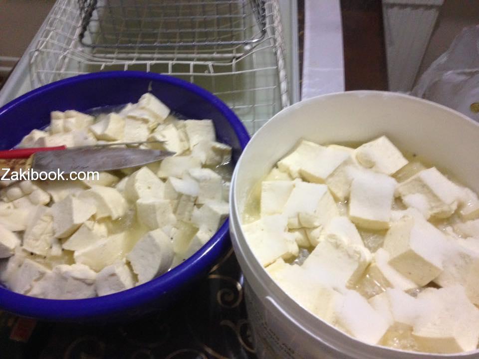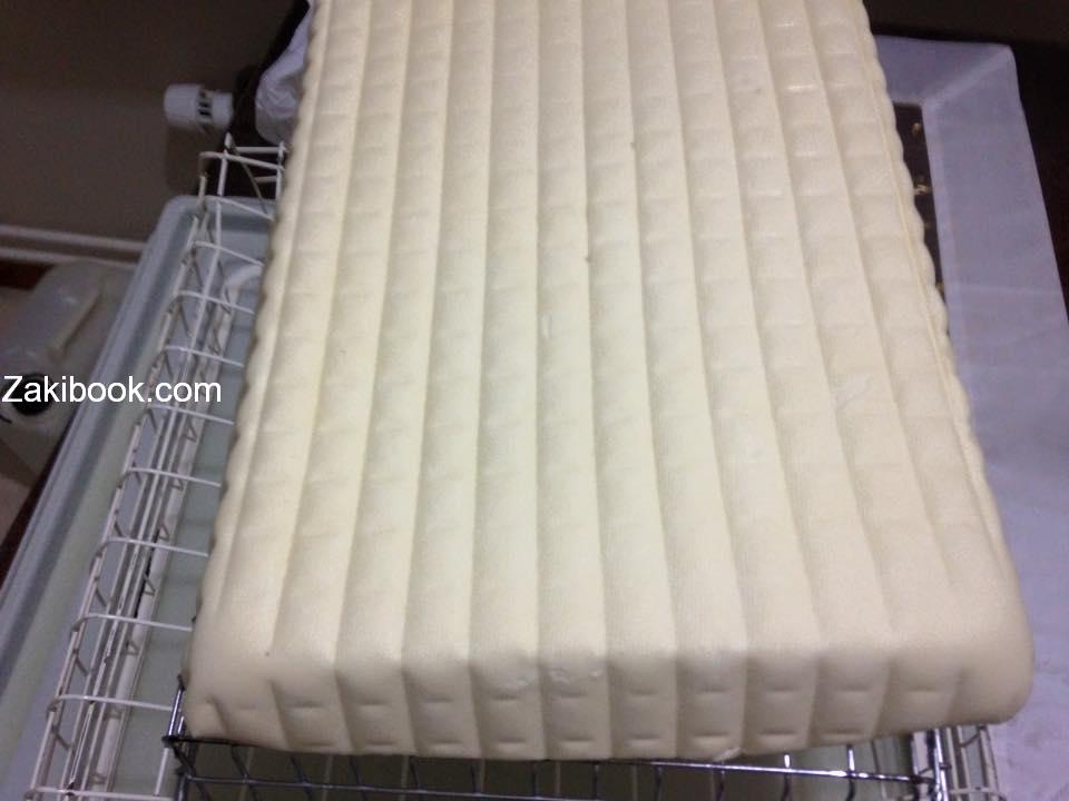 وبعدين بتصفيها من الماء عن طريق الشاشية (قطعة قماش قطنية خفيفة) متل بالصورة وبتحطي فوقها وزن ثقيل كمان متل بلصورة لمدة ساعتين