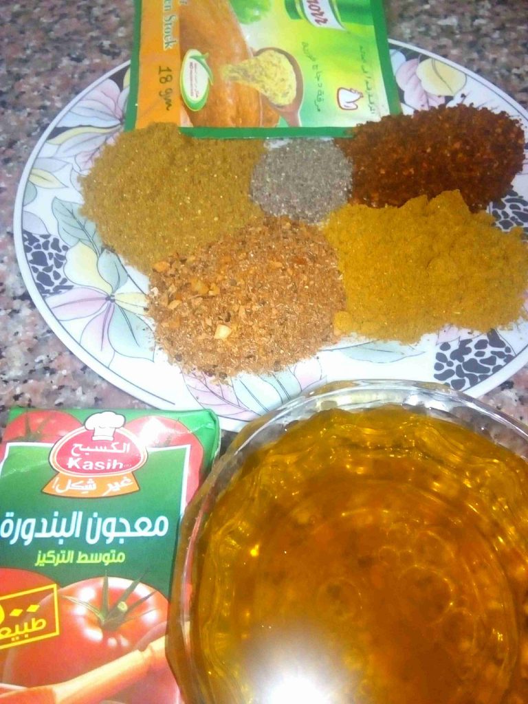 ملح وفلفل وزيت الزيتون وخل وبهارات كاري وشطة مجروشة وبهارات دجاج وصلصة بندورة وكنور بودرة وبنتبل الدجاجة مزبوط .