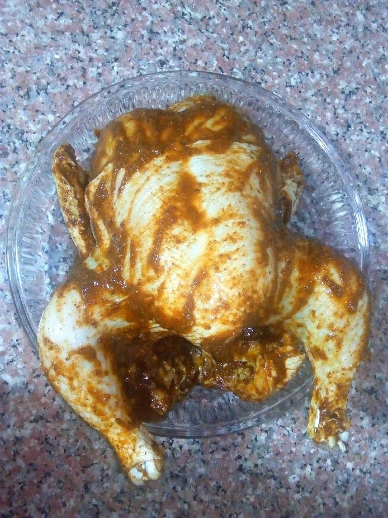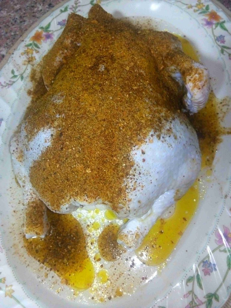 بنجهز دجاجة كاملة وبنظفها مزبوط من الداخل والخارج وبنتبلها لعدة ساعات او من قبل بيوم ب