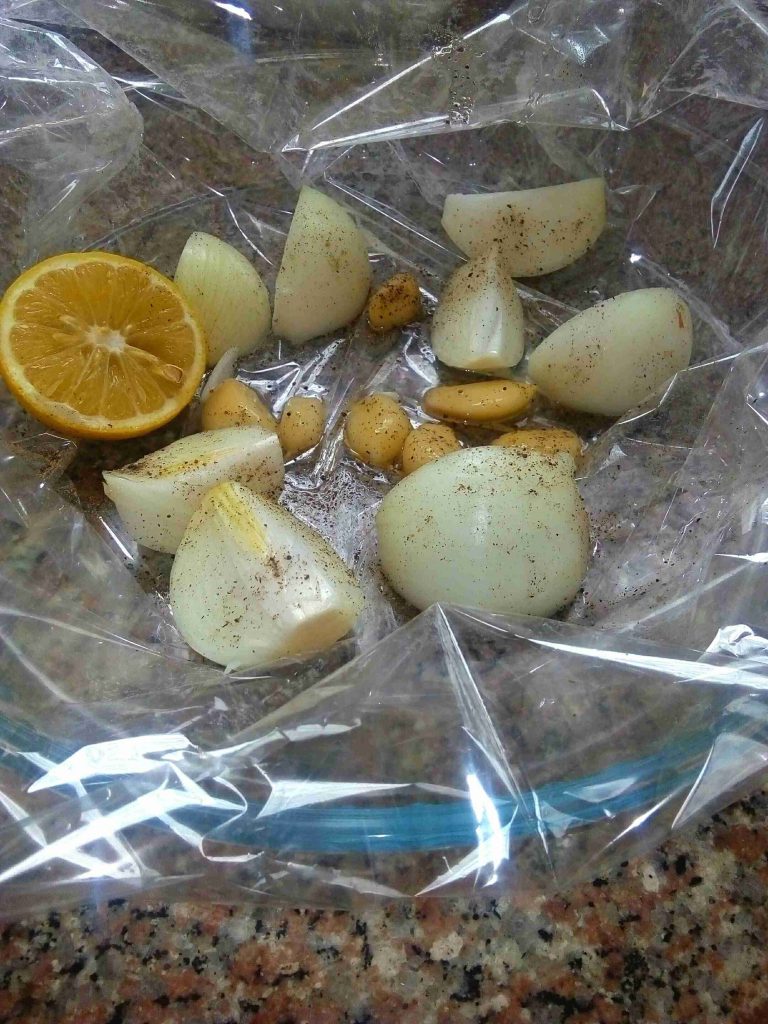 بنقطع بصل وبندورة ونصف ليمونة وبنحطهم في الكيس الحراري ما حبيت احط خضار زيادة لانه الارز معه خضار وبنتبلهم برضه بملح وفلفل وزيت وبنحط الدجاجة فوقهم وبنسكر الكيس وعالفرن اول نص ساعة على اعلى حرارة وبعدين بنوطي الفرن عالاخر لمدة ساعة ونص.