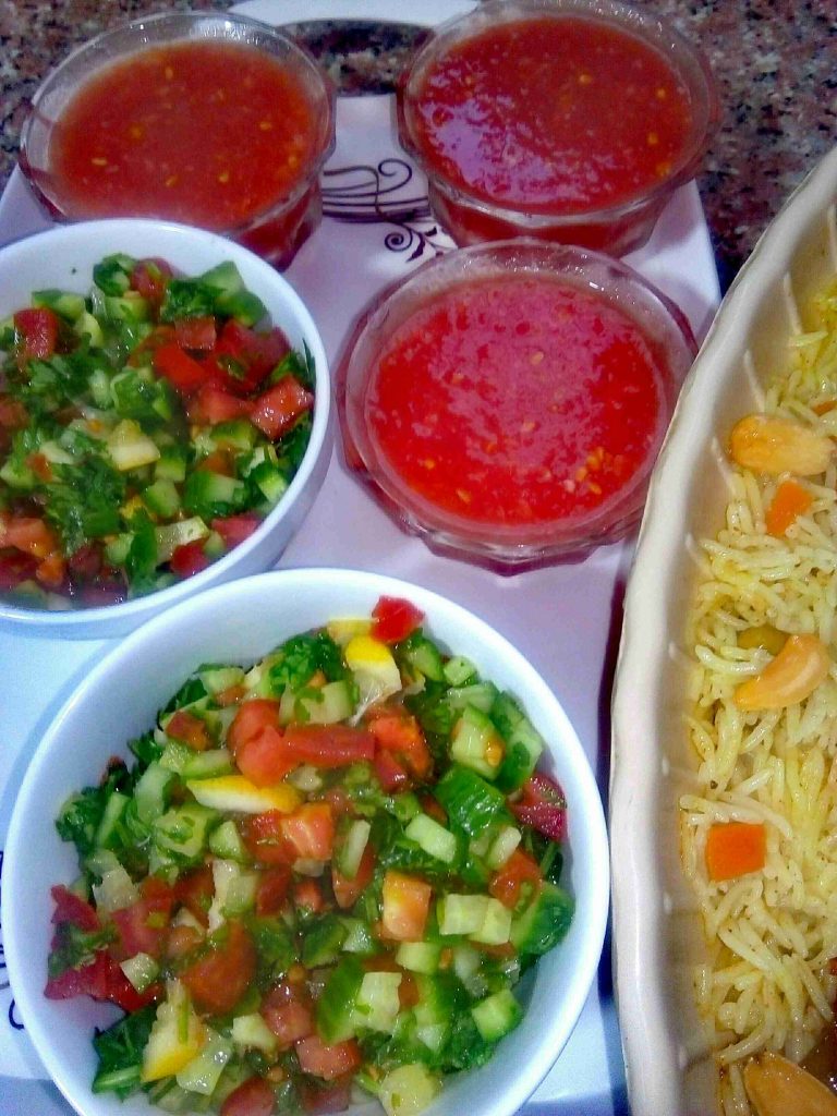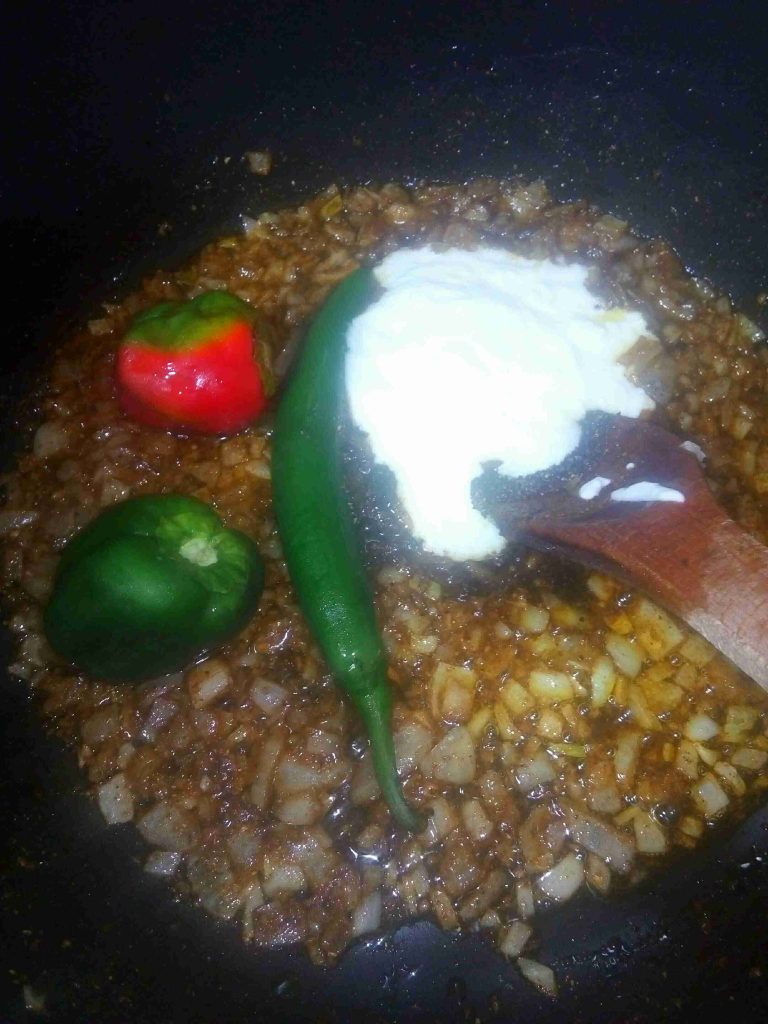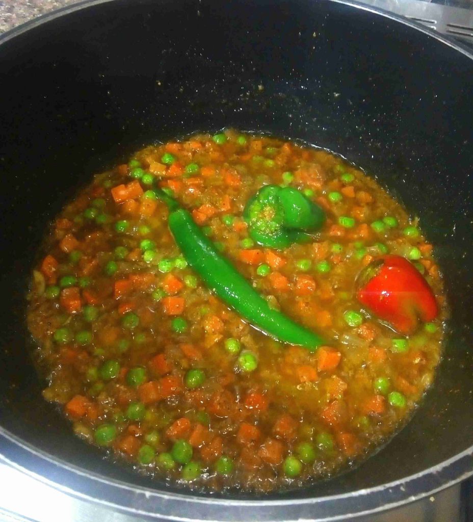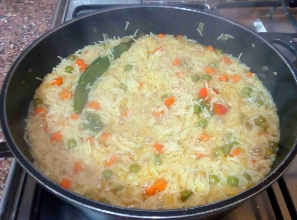 بنحضر بصل وثوم مفرومين وفلفل حر وحلو وبنقلبهم في زيت ذرة مع البهارات نفسها المستخدمة للدجاجة وبنضيف ملعقتين لبن رايب وبس يختلط ويختفي بنضيف البازيلاء والجزر وبنتركه يستوي وبعد الاستواء بنضيف الارز البسمتي المنقوع وبنقلبه معهم وبنضيف مي مغلية وبنكمل طبخة كالعادة بس تتنشف ميته بنوطيه لثلث ساعة.