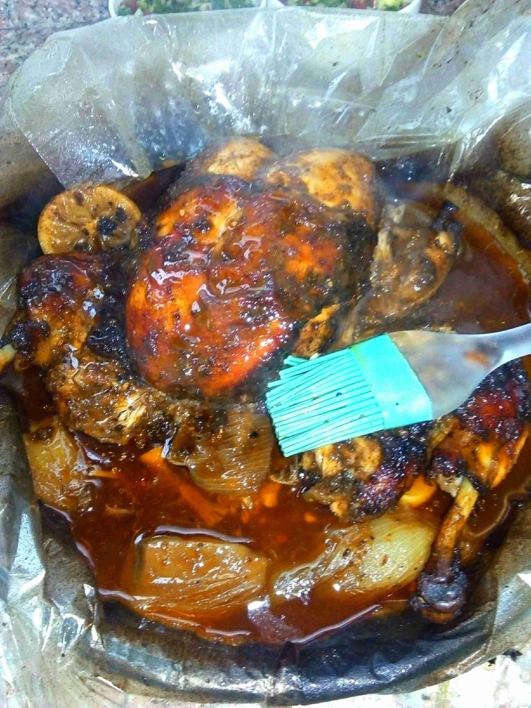 وبس نطلعها من الفرن بندهنها من الخلاصة اللي تحتها من صوص ودهن الدجاجة لتعطيها لون ولمعه رائعه.