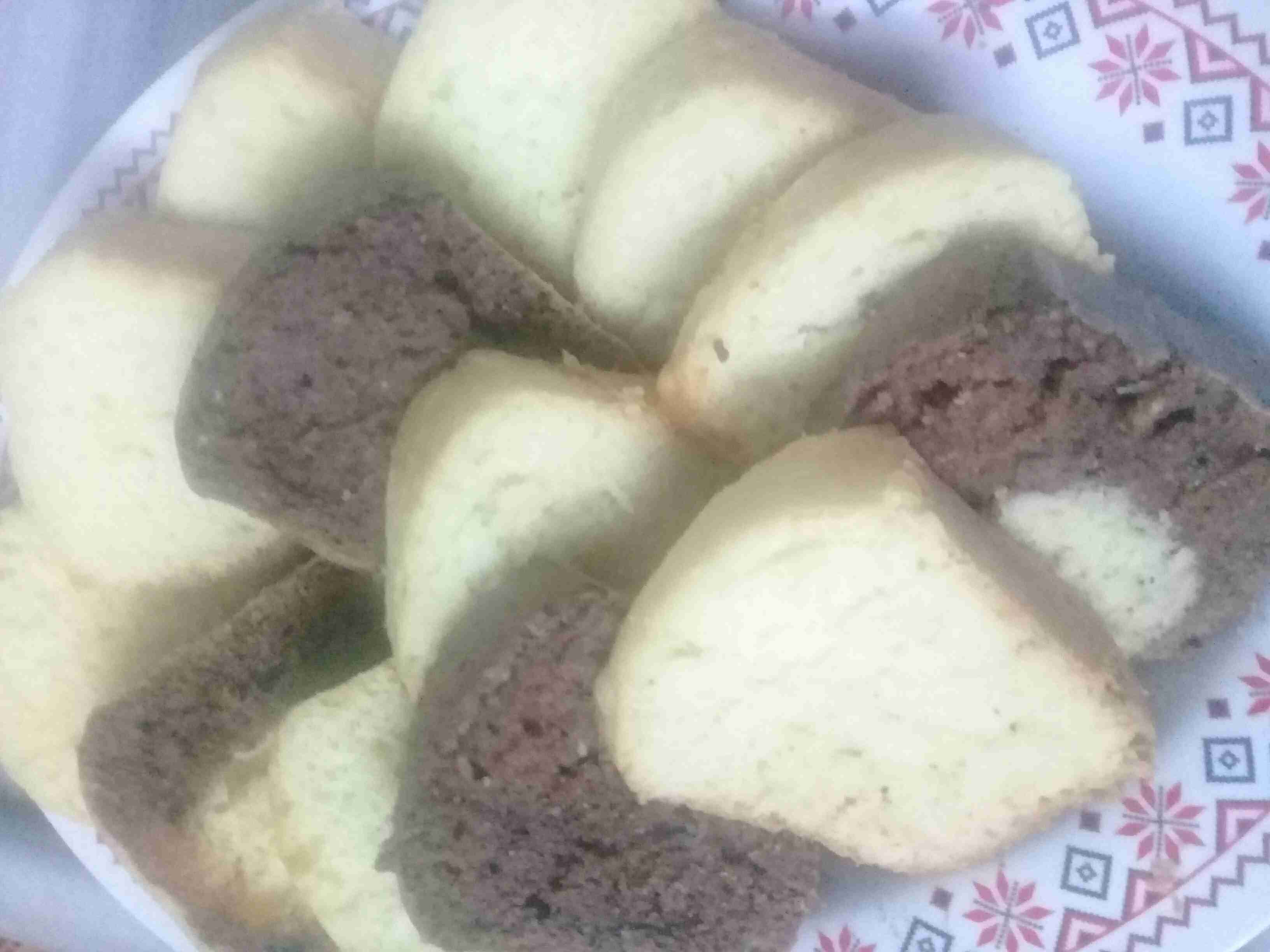 ٥. جبت قالب دهنتوا زيت وطحين وحطيت من الخليط مع بعض الخليط ابيض وخليط كاكاو وخبزتوا مدة ساعة تقريبا وصحة وعافية .