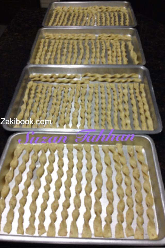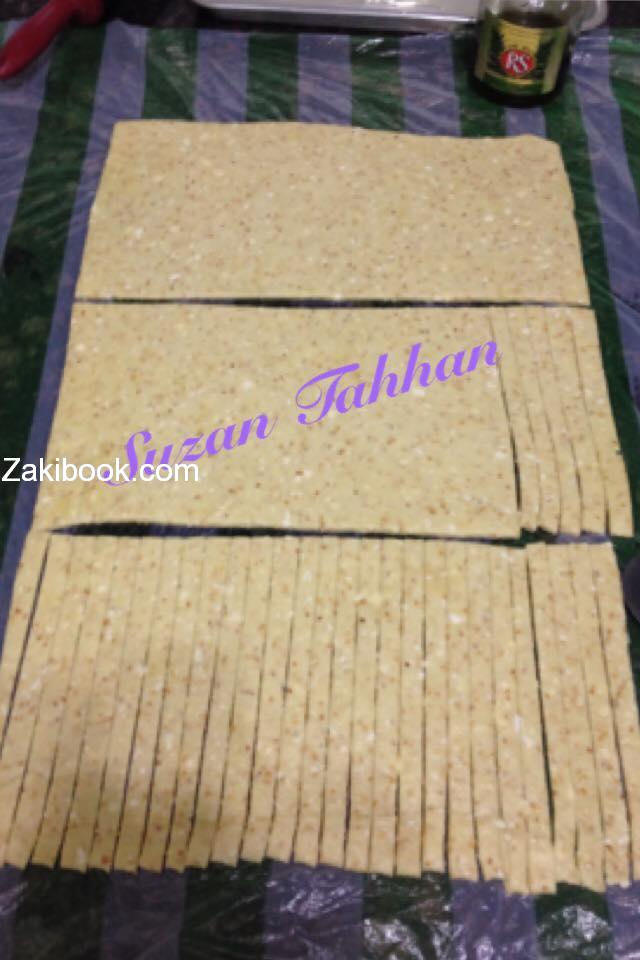 باستخدام قطاعة البيتزا (اسهل في التقطيع) قطعي العجينه الى شرائط رفيعه بعرض ١سم تقريبا. Suzan Tahhan
