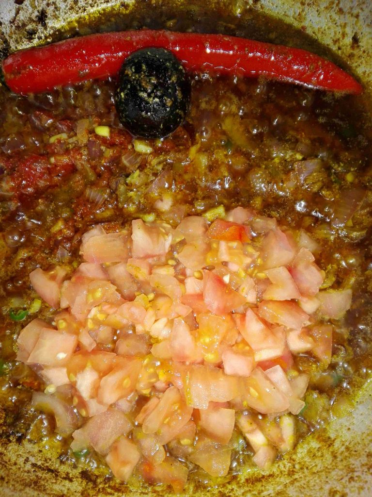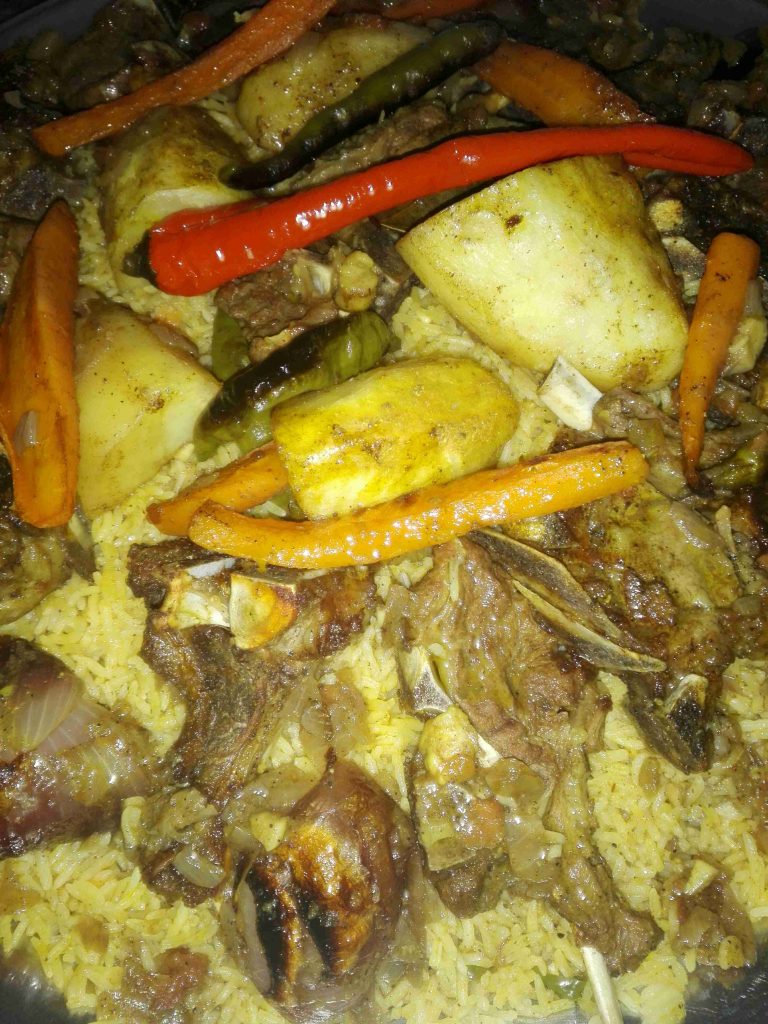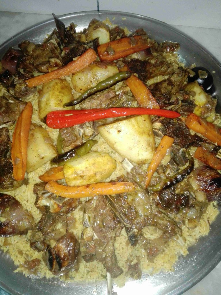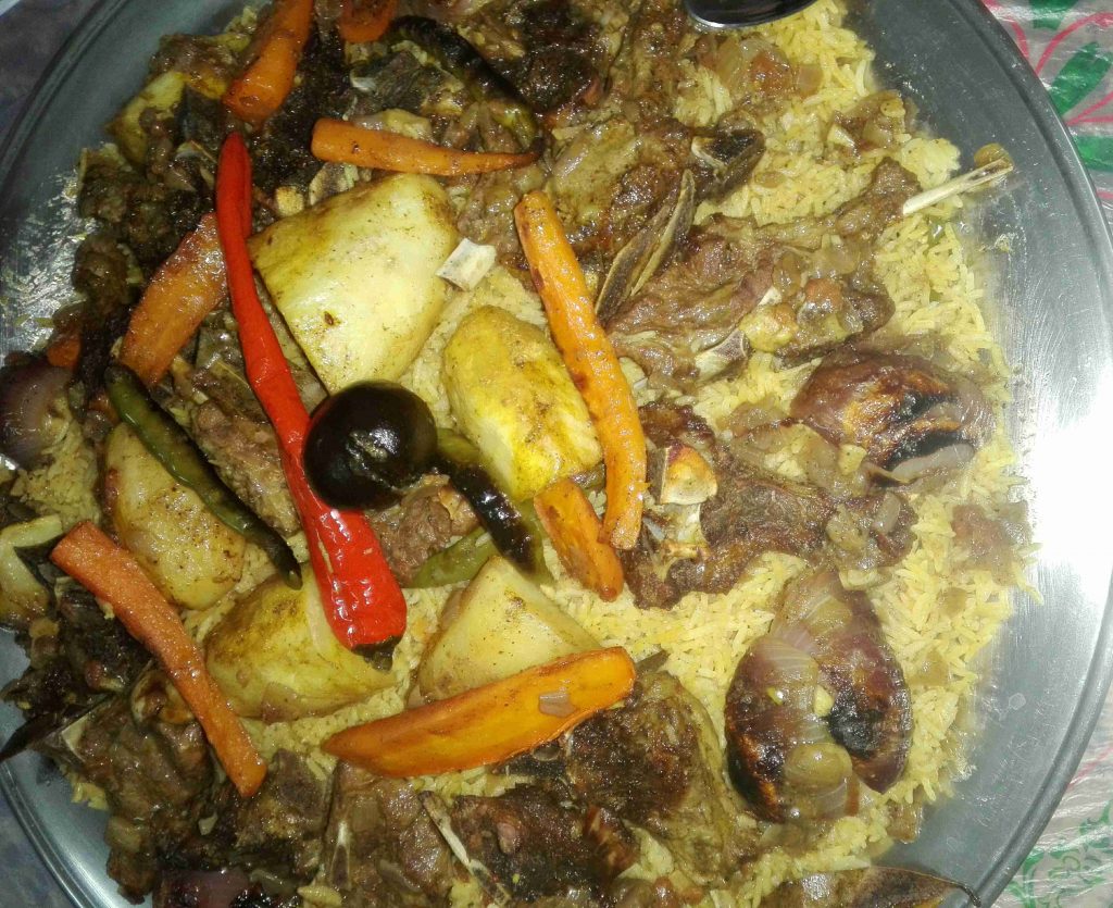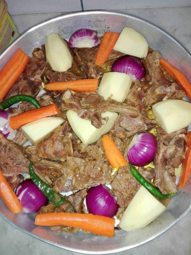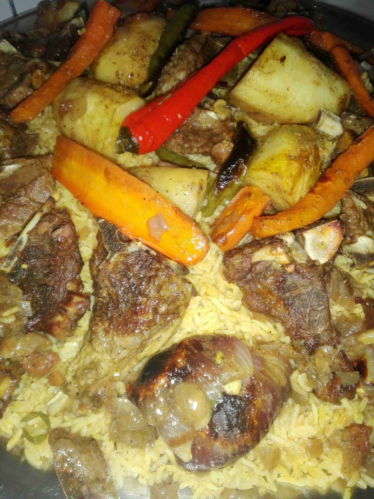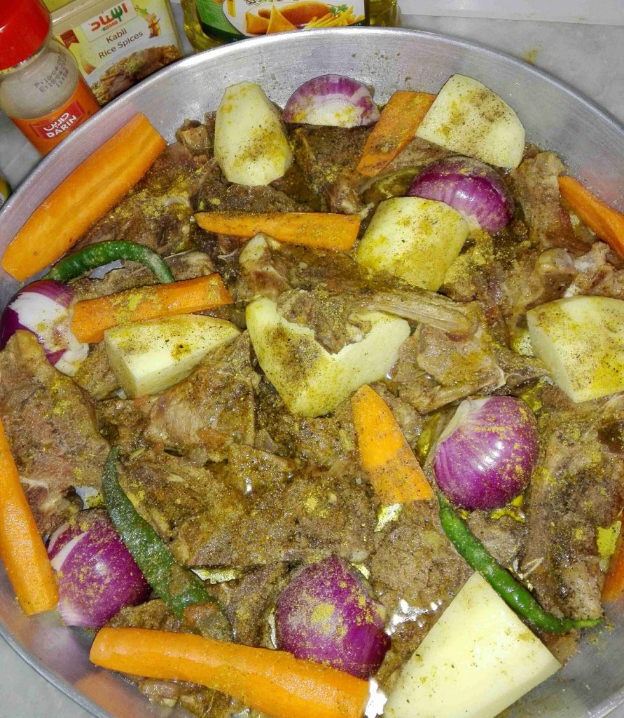& اول شي بنبلش باللحمه استخدمت لحمة ريش بنغسلها مزبوط وبقليها بزيت عالنار عاليه لحتى تاخذ لون ..وبعدين بضيفلها بصله مفرومه وبقلبهم سوا ..وبضيف الثوم المفروم او المهروس ..وبضيف فلفل اسود وكاري وبهارات برياني وبقلبهم سوا لحتى يتقلو مزبوط بضيف الفلفل الحار او حلو وزر بندوره مفروم وبعد ما يتقلبو عالنار عاليه ما بوطي تحتها هالفتره عشان ما تنزل ميتها وطبعا بدون اضافة ملح عشان ما تشد …وبعدين بشيلهم وبضعهم بصينية الفرن وبضيفلها الخضار يلي مقطعه قطع كبيره يلي هي جزر وبطاطا وبصل وفلفل حار ..