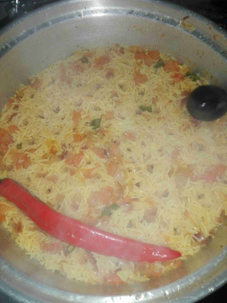 بنفس الطنجره يلي قليت فيها اللحمه ..بقلي بصله مفرومه وثوم مفروم او مهروس وفلفل حار مفروم وحبة فلفل حار كامله وحبة لومي بقلبهم سوا وبضيف جميع البهارات يلي للارز وبقليهم ..ويلي همو ملح فلفل اسود كاري بهارات برياني او اي نوع بهارات مو شرط ورشة هيل مطحون ومعلقتين لبن رايب ..ومعلقة صلصلة البندوره..وماجي وبعد ما يتقلو وتطلع ريحتهم بضيف البندوره المفرومه وبقلبهم سوا ..وبعد هيك بصفي الارز وبضيفه وبقلبهم وبضيفله مي لحتى ينغمر وبخليه عالنار عاليه لحتى يتشرب كل المي بوطي تحته عالاخر وبتركه يستوي عالراحته بدون تحريك …