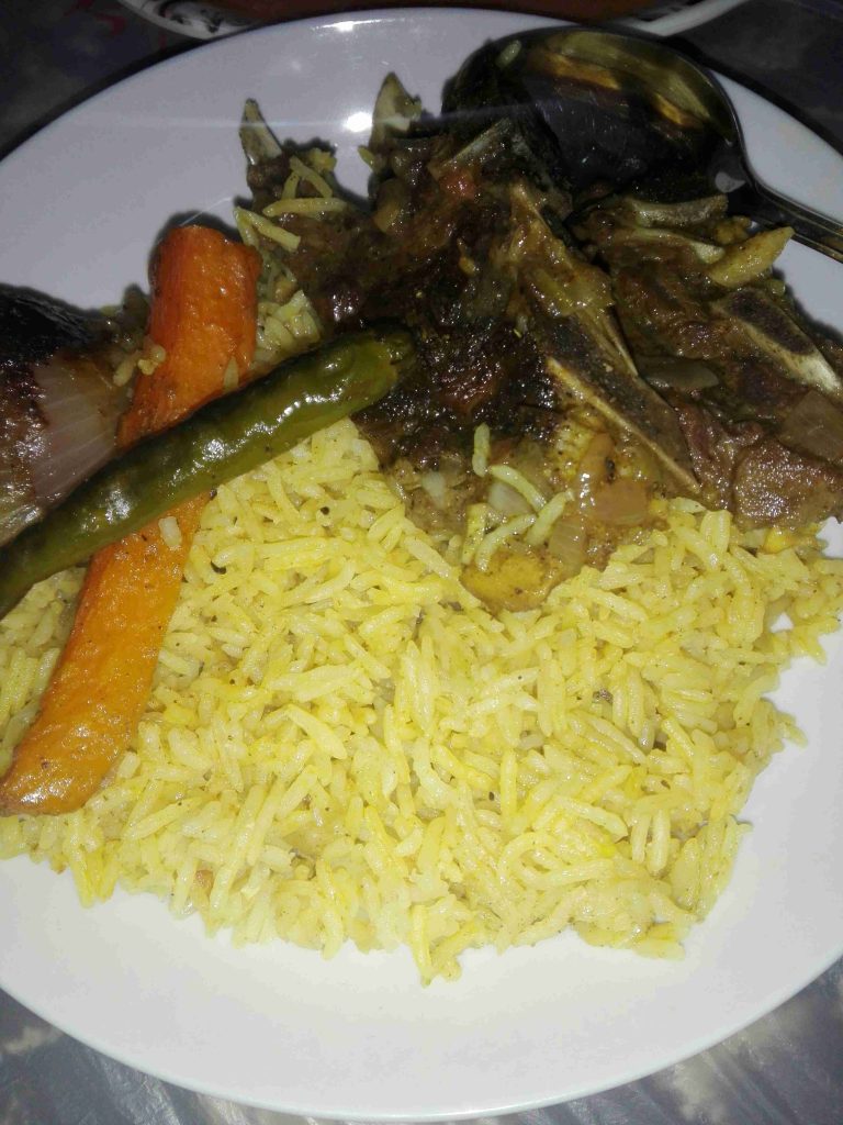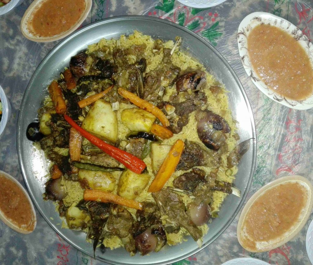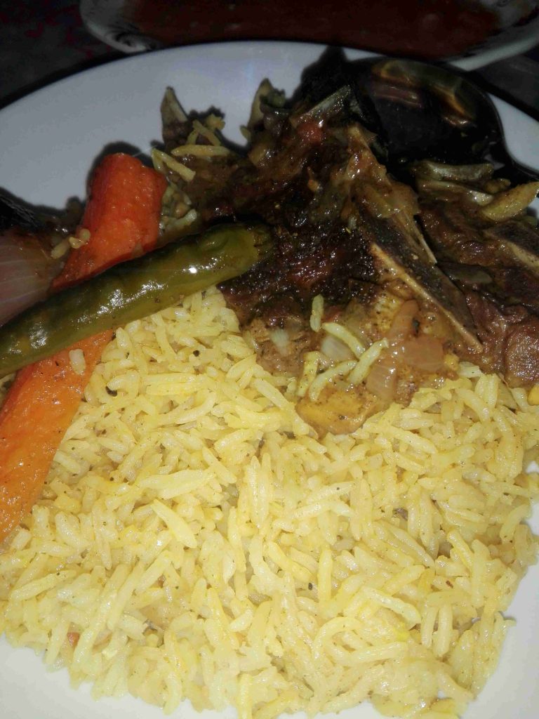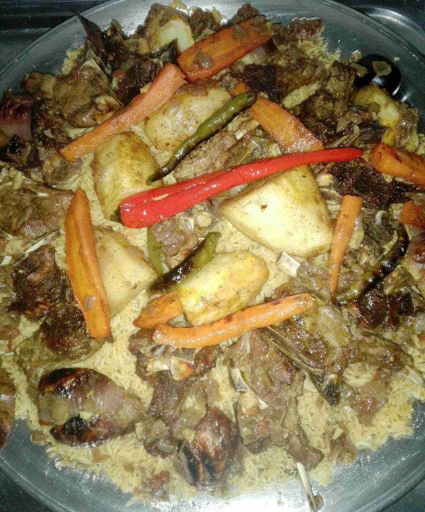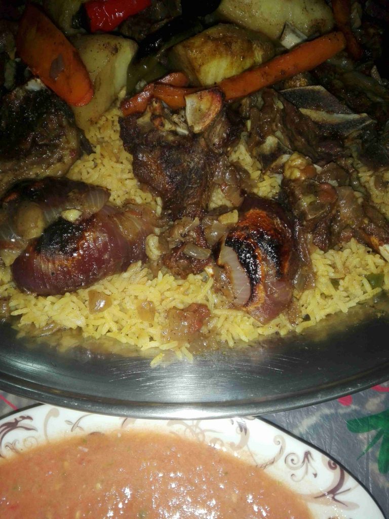 & واخر شي بقدمه مع اللحمه والخضار …وبتزين باللوز المقلي والزبيب ..بس انا ما ضفتهم