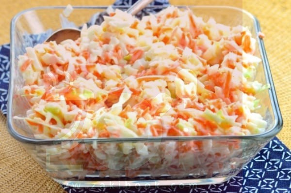 ثم نقوم بوضع الخضار في وعاء عميق ونمزج المايونيز واللبن والملح وحمض الليمون والحليب كامل الدسم والخل  والفلفل  الاسود مزيجا جيدا