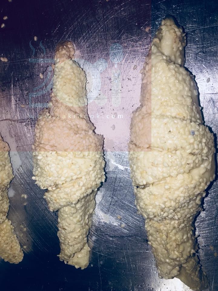 وارجعي لفيها ورجعيها للفريزر وبس تخمر افرديها وقطعيها مثل الصورة وشكلي حبات الكروسان مثل الصور واضحة الطريقة وبعدين غمسيها بحليب اثقيل وبعدين غمسيها بالسمسم