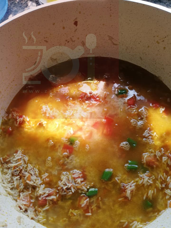 تقطع بصله مكعبات صغيره وتقطع بالمثل حبتين بندوره وبرش جزرتين ومكعبات فلفل حلو ملون بنقالي البصله وبنضيف لها التوابل والملح حسب الكميه للارز وبنضيف الجزر حتا يذبل وبنضيف الفلفل الحلو حتا يذبل وبنضيف البندورة بنقليهم شوي وبنطفي الغاز بنصف الرز وبنضيفه للخلطه كل كاسة رز بسمتي بنحطلها كاسة مي بنحركهم وبنغطيهم بورق الألمنيوم ونعمل فيه مثل الحفره عشان نحط الدجاج عليه ونعمل ثقوب بالقصدير