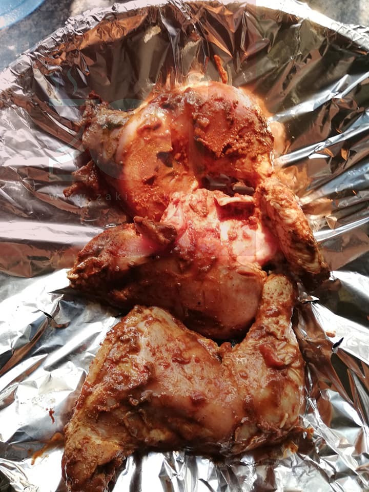 بنحط الدجاج فوق ورق الألمنيوم المثقوب ويغطى بطبقه ثانيه من ورق القصدير يوضع بالفرن على 180بياخذ من ساعة ونصف إلى ساعتين حسب الكميه وصحه وهنا