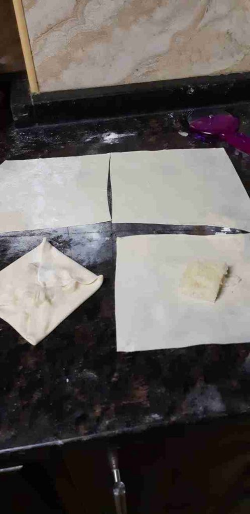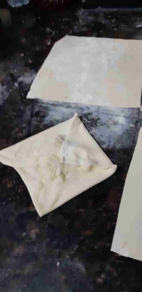 . نرش كمية قليلة من الطحين على سطح الطاولة، ثم نفرد كل جزء من العجينة على شكل مربع رقيق،