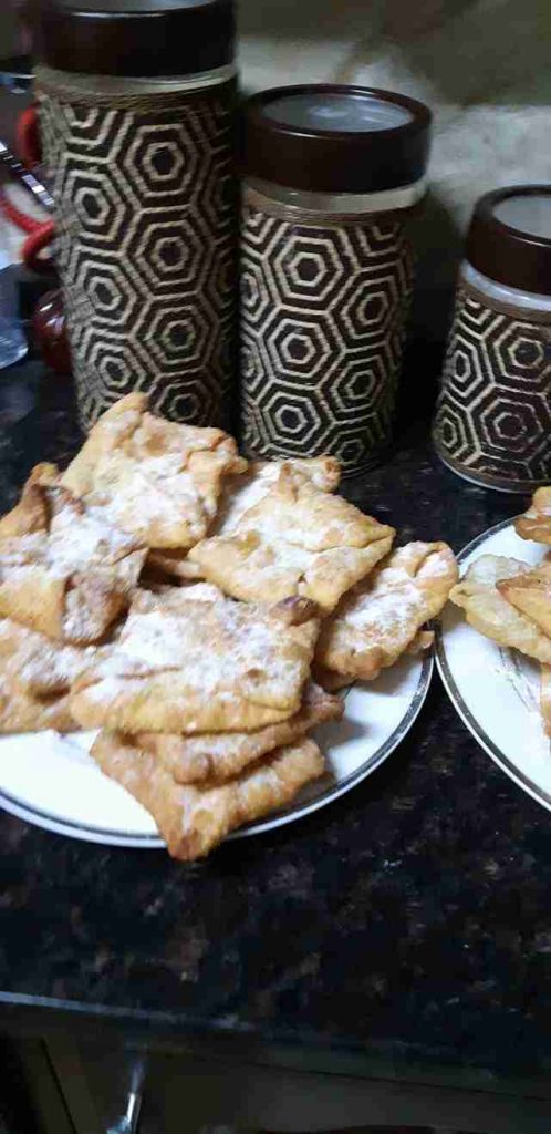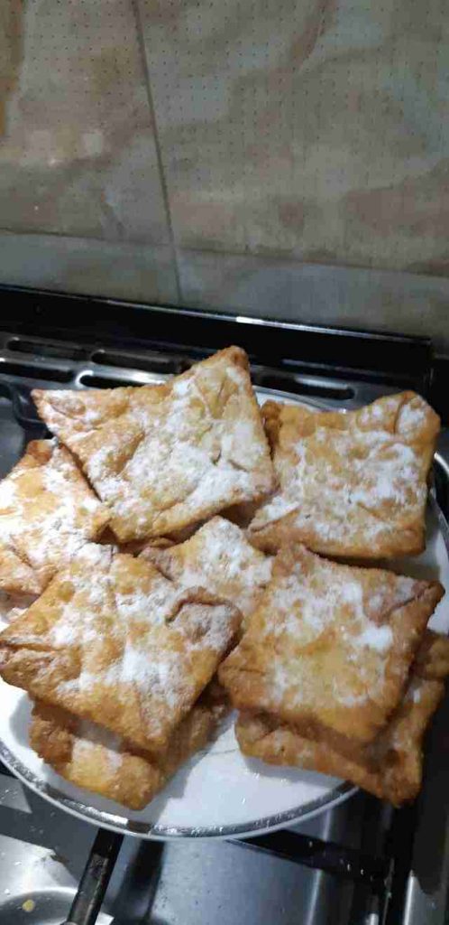 ثم نضع الحشوة في وسط المربع، وبعد ذلك نمسك أطراف زواية العجينة ونردها فوق الحشوة حتى نغطي الحشوة، ثم بكف اليد نضغط قليلاً على القطع لنرققها، ونكرر العملية هذه لباقي القطع. ملاحظة: يجب عدم شد العجينة على الحشوة. نحضر مقلاة، ونسكب فيها الزيت ليحمى، ثم نقلي قطع التمرية فيه، ونزيلها من الزيت بعد أن يصبح لونها ذهبيّاً مشقراً. نصفيها من الزيت، ثم نرش بودرة السكر مباشرة عليه وهي ساخنة، وبعد ذلك نرتبها في صحون التقديم، ونقدمها ساخنة.