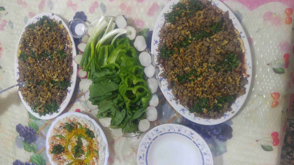 ناخذ 3 حبات باذنجان نشويهم عالغاز ونقشرهم ونغسلهم ونفرمو عالوح الخشب بالسكين ونضيف التوم واللبن والطحينه والملح ونحركو منيح ونصبو بصحون التقديم ومنكون مجهزين اللحمه والبندوره نضعهم عالوجه ونزينو بالبقدونس والجوز ونكوي السمنه عالنار ونضعها فوقو وياكل بجانبو الخضروات وصحه وهنا عاقلبكن اتفضلو