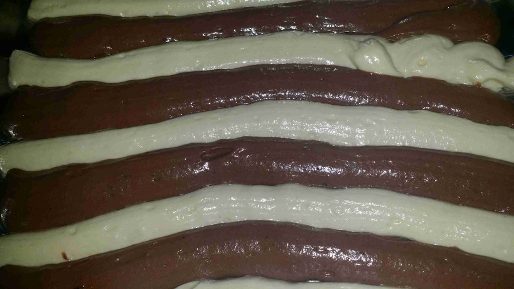 بعدين نضرب الزبدة مع السكر والفانيليا والملح بمضرب كهربائي حتئ يمتزجو ويصبح كريمي نضيف واحدة بيضة ونخلط على اقل رقم ثم نضيف البيضة الثانية ونمزجهم بعدين نضيف نصف كمية الحليب المتبقية ونخلط شوي ونبدأ بحط الدقيق المنخول مع البيكنج باودر على ثلاث دفعات ونضيف عليهم باقي كمية الحليب ولما يختلط تمام نقسم نصف الكمية ونضيفة مع الكاكاو المذوب باالحليب ونترك الباقي كما هو