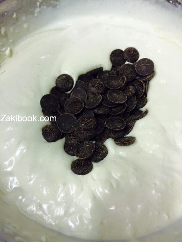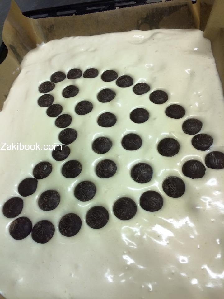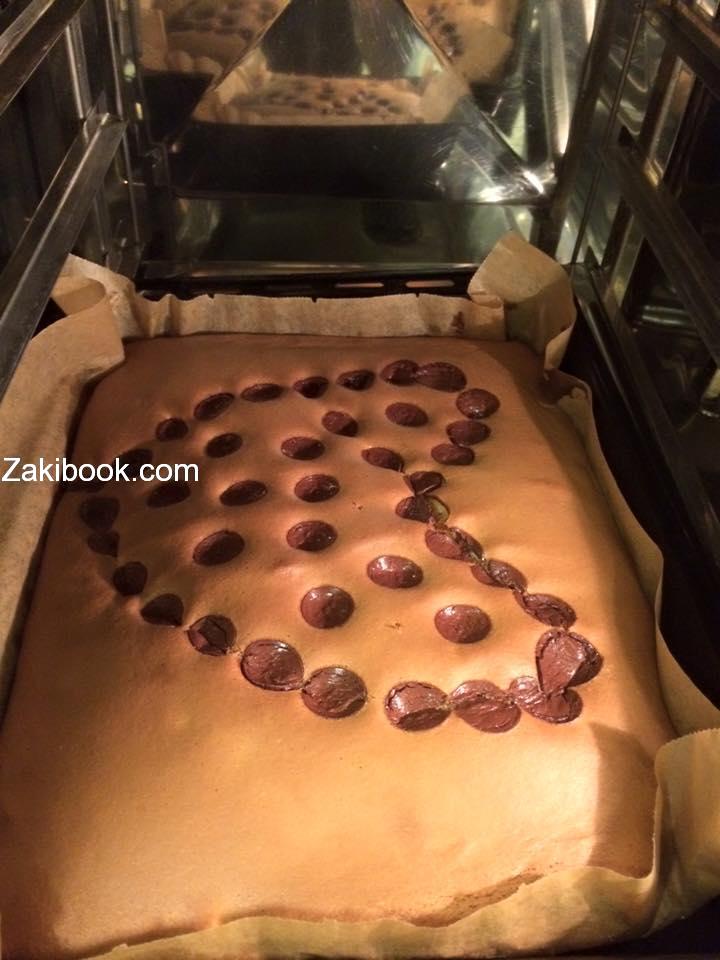 و ثم نضيف الشوكولا و نحرك قليلآ و نضع ورق زبده عل صينية و نسكب الخلط و يوضع بالفرن عل حرارة ١٨٠ مدة من ٢٥ دقيقا الى ٣٠ حتى يصبح الون الذهبي