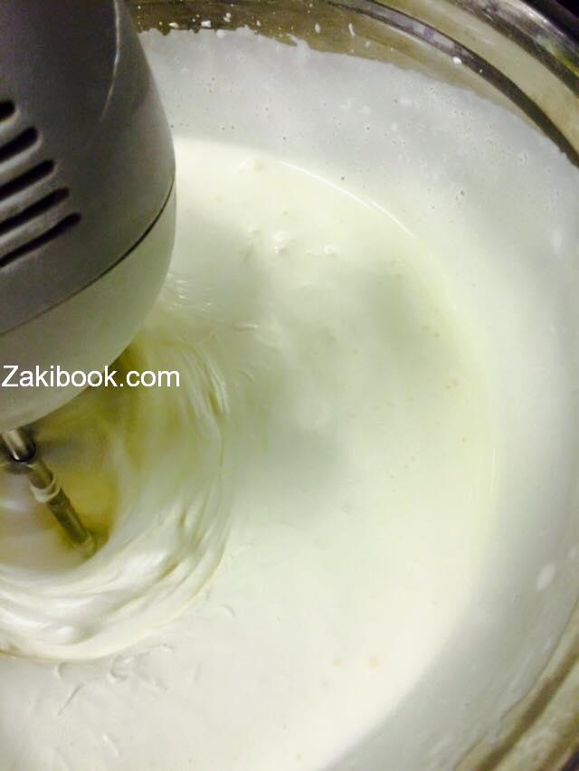 نضع البيض مع الصفار و ملعقتين عصير لليمون و نخفق البيض مدة دقيقتين و ثم نضيف سكر بالتدريج و ثم نخلط مدة عشرة دقائق حتى يصبح متماسك جيدآ