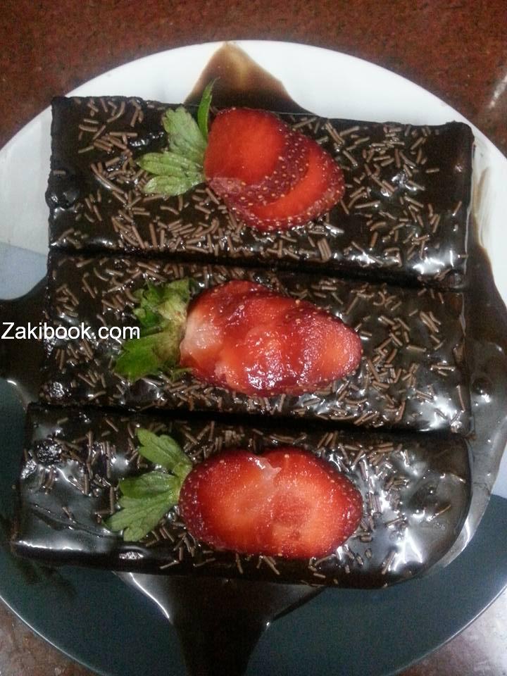 5 – بعد أن تبرد الكيكة ، نصب فوقها كأس الخليط الذي إحتفظنا به سابقا وتزين بشرائح الفريز ومبشور الشوكولاته وتقطع حسب الرغبة ، وتقدم بصحة وهناء.