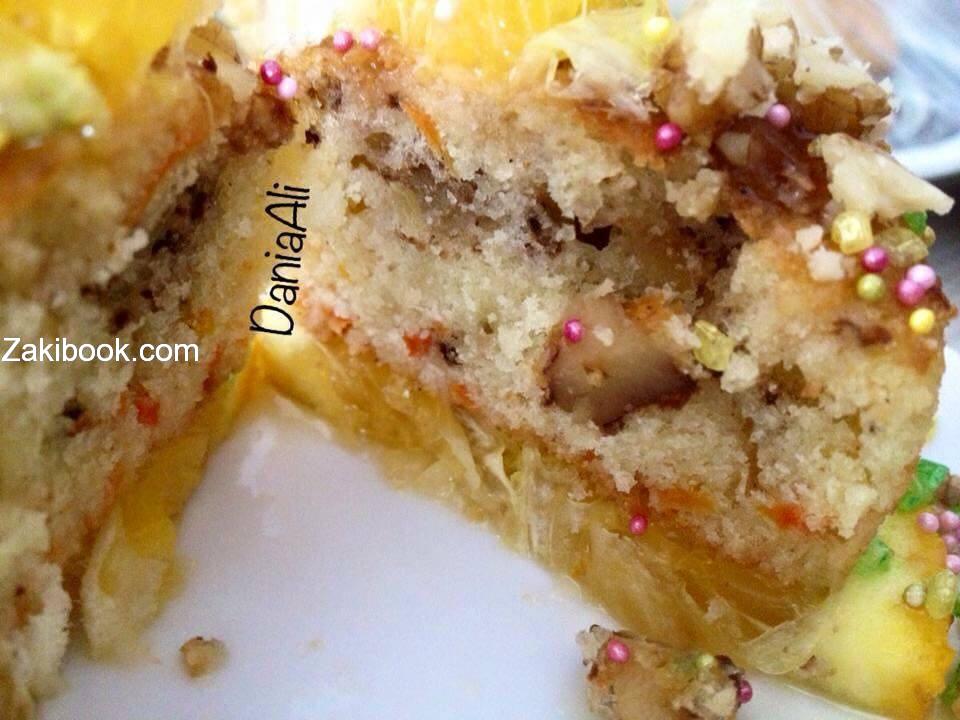 ومن ثم أضيفي الطحين والجوز والبيكنك باودر الى حين تجانس الخليط ويوضع بقوالب الكب كيك الى النصف بكل قالب ويشوى على درجة حرارة ٢٢٥درجة لمدة ١٥ -٢٠ دقيقة وألف عافية