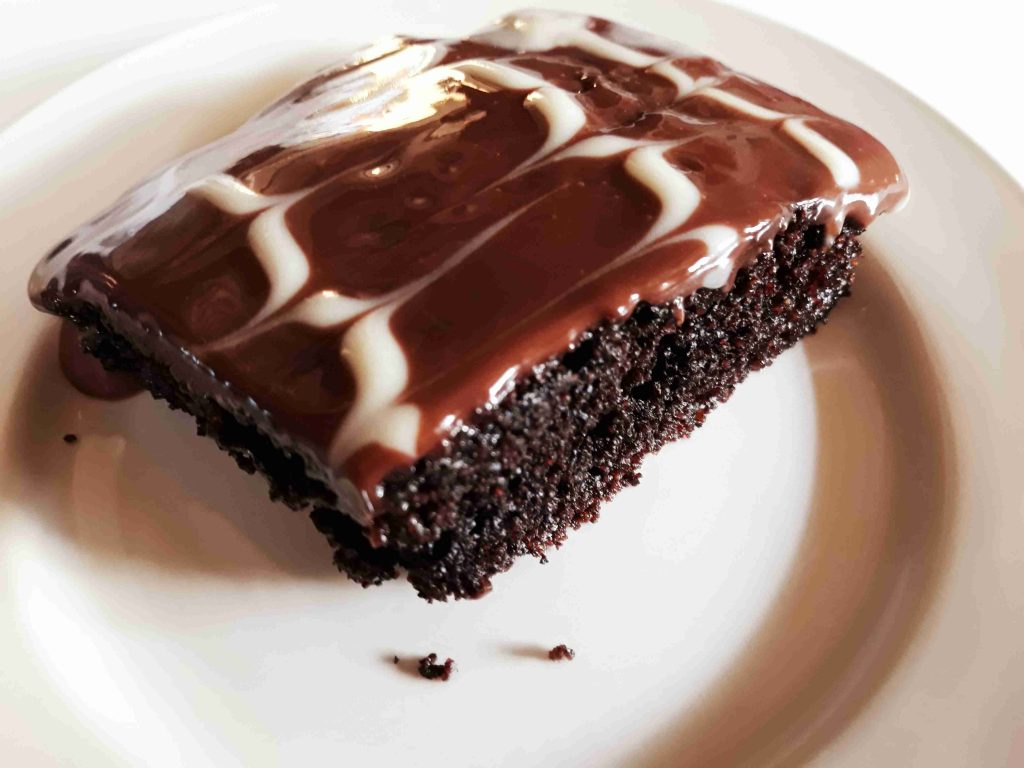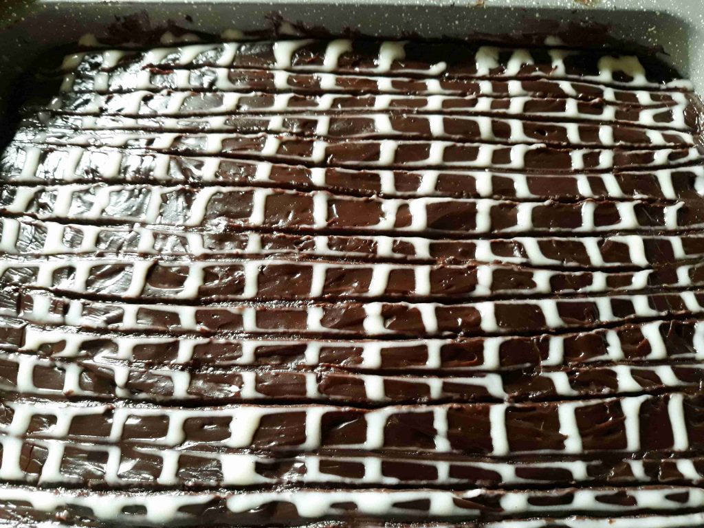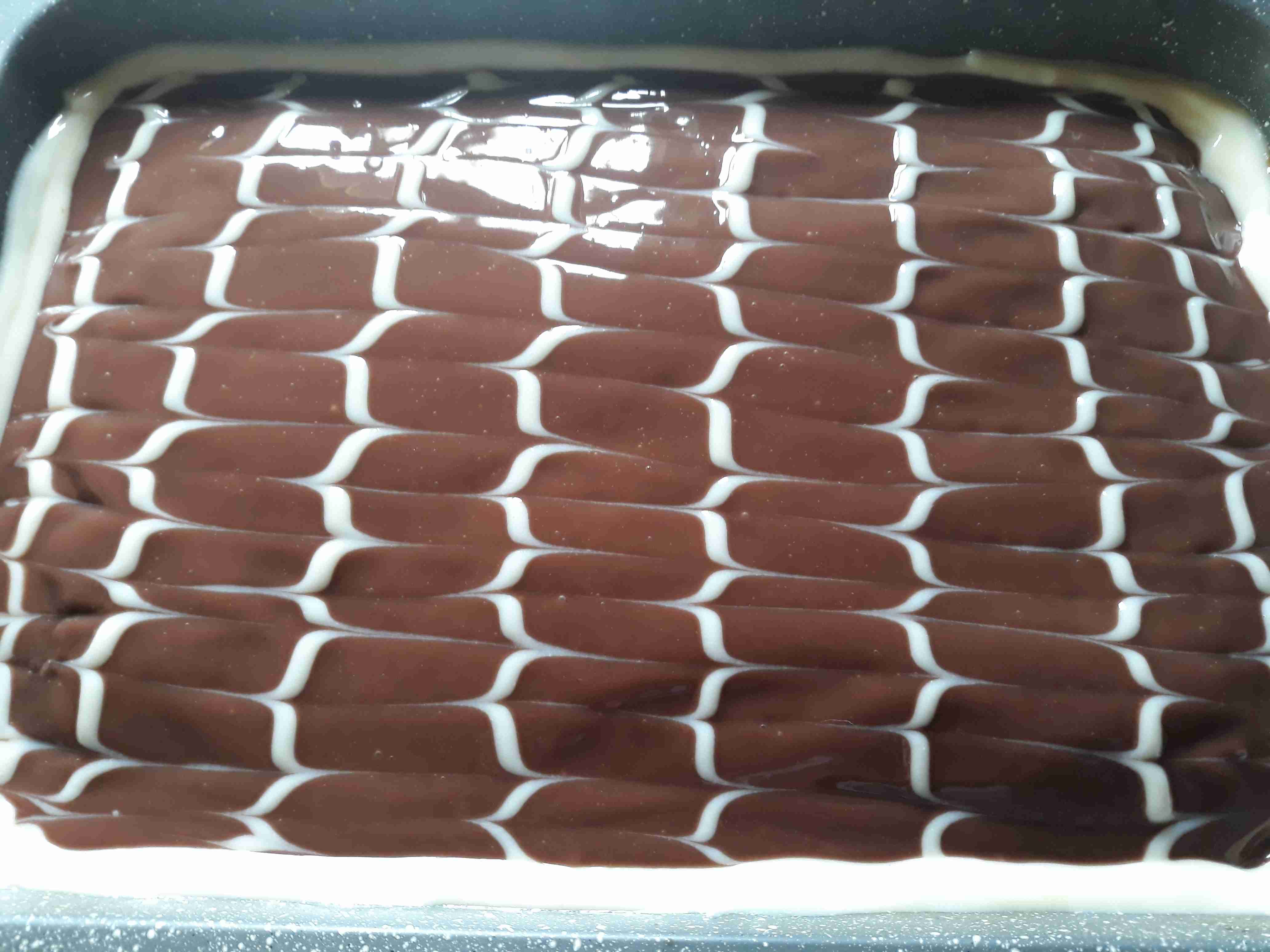 والطحين الي بنكون ناخلينو مع البيكنج باودر والكاكاو وبنضيفهم على خليط البيض وبنخلطهم لما يمتزجو منيح ويتجانس الخليط بندير الخليط بصينيه فرن مدهونه طحينه وبنفوتها على فرن محمى لمده عشرين دقيقه تقريبا واكيد على حسب الفرن الموجود عنا على درجه 180 على نار هاديه ولما تستوي بنشربها بالقطر البارد تماما وهيه سخنه وبنتركها تبرد منيح وبنجهز مهلبيه الشوكولاه بنخلط جميع المقادير منيح على البارد ما عدا الزبده وبنحطهم على الغاز مع استمرار التحريك لما يشتد الخليط ويتماسك بنطفي الغاز وبنضيف الزبده وبنحركها معهم وبندير المهلبيه فوق صينيه البسبوسه وبنفردها بالتساوي بمعلقه. وبنزينها بخطوط كريمه سائله او اي اشي انتو بتحبوه الخيار لالكم اكيد وبتتركوها تبرد وبتقدموها